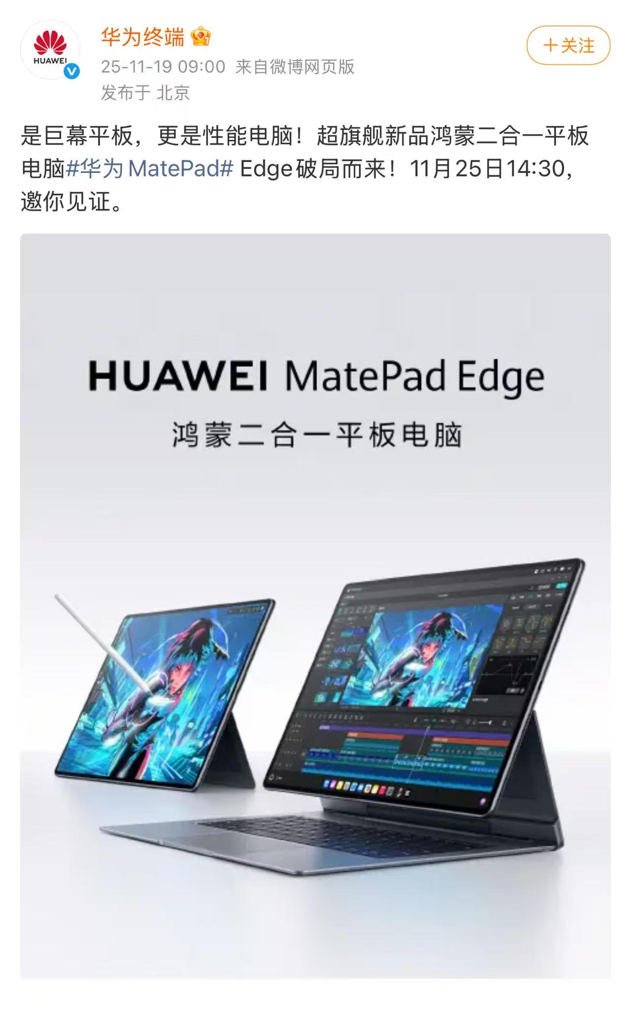 华为终端今日再度成为科技圈焦点!11月19日,余承东在微博发布了一则趣味预热视频,内容围绕“挑战1+1食物组合”展开,巧妙暗示即将发布的新品具备“1+1>2”的融合体验。视频结尾的花字“HUAWEI MatePad Edge是平板,更是电脑”正式揭晓了这款华为MatePad Edge鸿蒙二合一平板电脑的身份,也标志着华为时隔三年再次进军二合一设备市场,引发广泛期待。 从预热海报和视频中透露的产品设计来看,华为MatePad Edge可谓诚意满满。它采用了全屏无刘海的设计,营造出沉浸式的视觉体验,配合超窄边框,无论是观影还是创作都能享受到更纯粹的视野。此外,全新的星跃悬浮键盘不仅提升了整体的质感,还通过磁吸式结构实现了平板与键盘的灵活切换,兼顾便携与功能性。手写笔的交互也是一大亮点,从视频中可以看出,笔触响应流畅,支持压感与低延迟,预计将在绘图、笔记和多任务操作中带来更高效率。 功能方面,基于“是平板,更是电脑”的定位,可以猜测华为MatePad Edge将搭载鸿蒙操作系统6,并具备电脑级性能。它有望融合移动端与桌面端双生态,用户既能享受平板模式的触控便捷,又能切换至PC模式进行键鼠高效操作,解决传统二合一设备性能不足、生态割裂的痛点。无论是办公、创作还是娱乐,这款产品都可能成为多场景下的全能伙伴。 华为首款鸿蒙二合一平板的登场,无疑将重新定义行业标准,感兴趣的朋友记得锁定11月25日新品发布会,一探究竟!