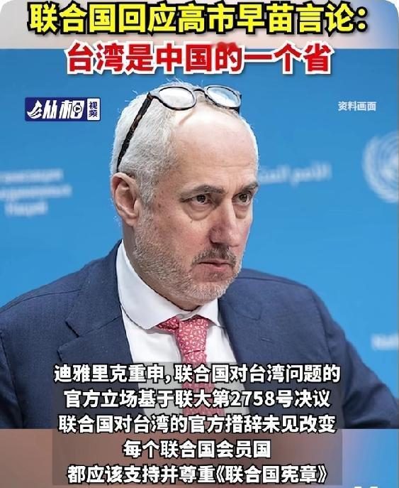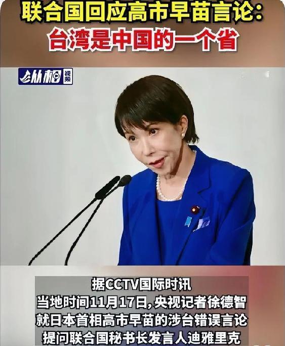 日相涉台言论彻底激怒了大家! 连联合国都忍不住公开表态: 台湾是中国领土谁敢动就是侵略! 这下事情彻底闹大了!联合国秘书长发言人迪雅里克17日直接回应,联大2758号决议早就白纸黑字写着,台湾是中国领土的一部分,这话说得非常清楚了,对不对?相当于给全世界画出一条清晰的底线:谁要是敢在台海搞小动作,咱们完全有权力自卫反击! 高市早苗这次算是碰了一鼻子灰。距离她发表那些不当言论已经过去10天,可她到现在还不肯收回,嘴硬得很。要我说啊,这已经不是随口说说那么简单,背后是日本右翼势力在战后国际秩序上踩红线!想想都后怕,要是军国主义真的卷土重来,东亚哪还有太平日子过? 这次咱们可真是出了口气,用实力把日本的野心压下去了。要知道,东亚各国要是没咱们镇着,日本说不定还会闹更多幺蛾子呢!大家觉得,是不是这个道理?要是各国都能像咱们这样坚定维护秩序,世界和平才能真的稳如泰山吧?