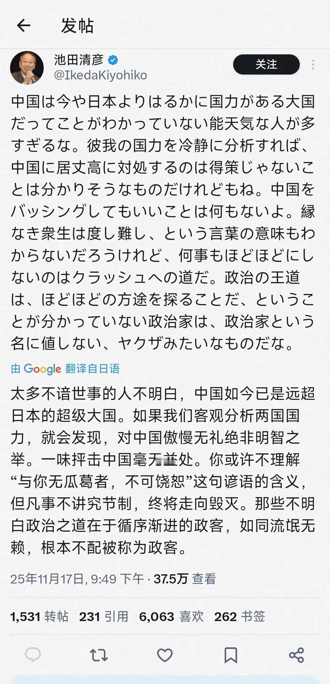 日本知名学者急了!捅破窗户纸!中国国力已远超日本!对中国傲慢,将会走向毁灭! 池田清彦是日本早稻田大学国际教养学部教授,且长期在富士电视台担任评论员,凭借毒舌风格和科普冷知识分享,成为日本全民知名知识分子。11月17号,池田发文痛批日本政客,捅破了中日目前真实实力差距的窗户纸。 太多不谙世事的人不明白,中国如今已是远超日本的超级大国。如果我们客观分析两国国力,就会发现,对中国傲慢无礼绝非明智之举。一味抨击中国毫无益处。你或许不理解“与你无瓜葛者,不可饶恕”这句谚语的含义,但凡事不讲究节制,终将走向毁灭。那些不明白政治之道在于循序渐进的政客,如同流氓无赖,根本不配被称为政客。 另外说明,其中“与你无瓜葛者,不可饶恕”这句谚语翻译的不好,正确意思更贴近“不学无术”。不学无术的意思是:一个没有学识的人是没有办法正确处理问题的。这个情况恰好与高市首相和小泉外相的拙劣表现高度吻合。