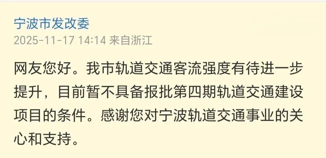 近日,宁波官方表示,轨道交通客流强度有待进一步提升,目前暂不具备报批第四期轨道交通建设项目的条件。