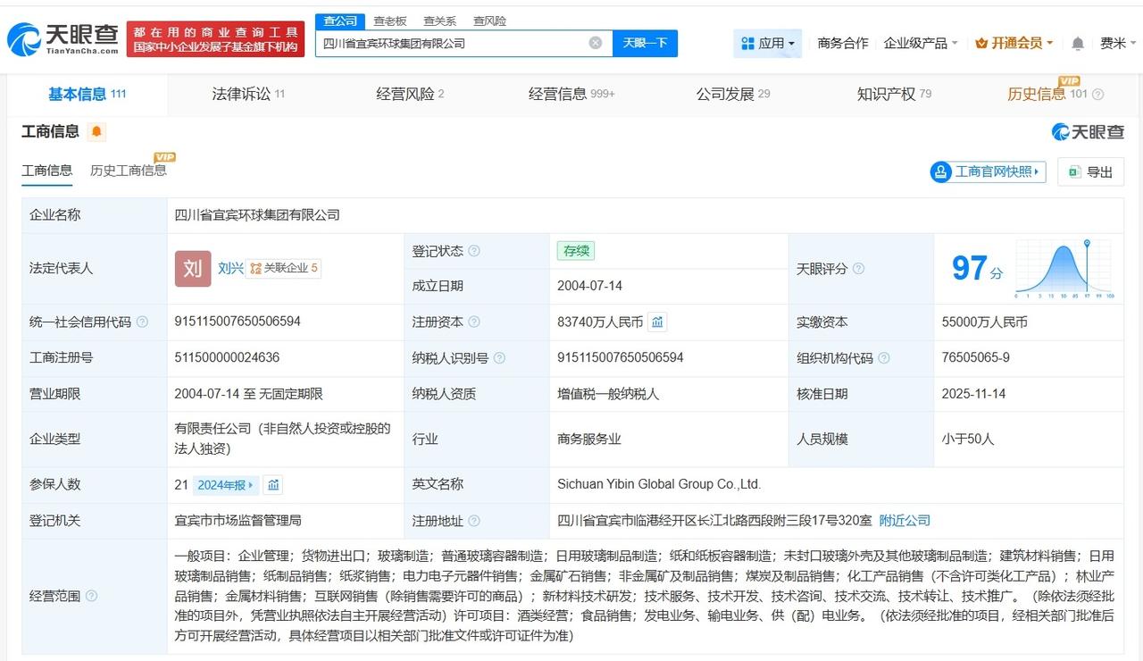 增幅约52% 天眼查App显示,近日,四川省宜宾环球集团有限公司发生工商变更,注册资本由5.5亿人民币增至约8.37亿人民币,增幅约52%。 四川省宜宾环球集团有限公司成立于2004年7月,法定代表人为刘兴,经营范围包含企业管理、货物进出口、玻璃制造、普通玻璃容器制造等。股东信息显示,该公司由四川省宜宾五粮液集团有限公司全资持股。 天眼查信息: