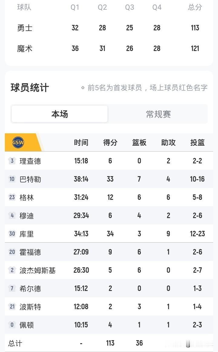 库里巴特勒67+空砍 勇士负魔术