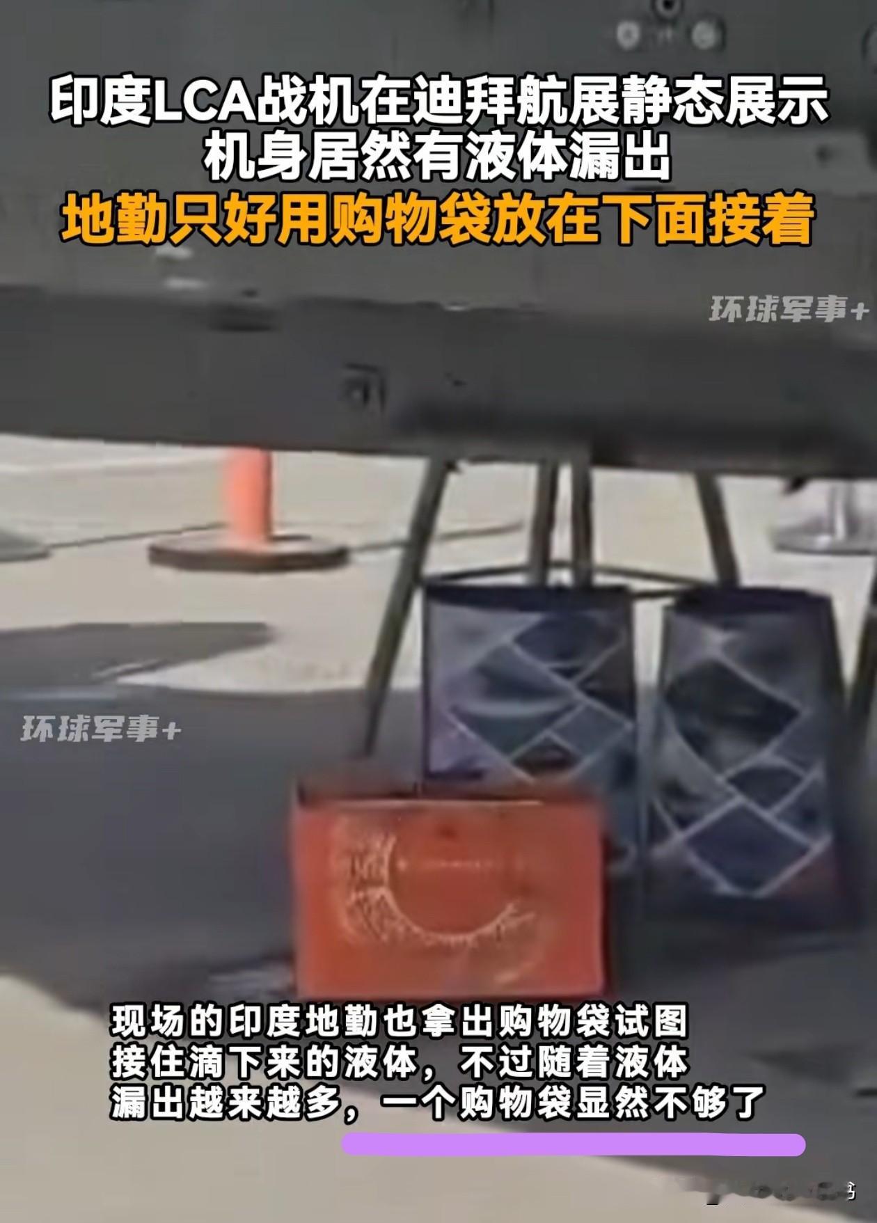 纸袋接机油!印度“光辉”战机迪拜上演漏油秀,外媒:这很“印度制造”,迪拜航展上,印度带着国产“光辉”战机意气风发地登台,本想向世界秀一把“印度制造”的肌肉,结果战机刚停稳没多久,机身下方就滴滴答答漏机油,印度技术人员现场上演“应急秀”,用航展购物袋接油,可你那是纸袋子,根本兜不住。然后就看到光辉战机下面流了一大滩。 围观群众纷纷举起手机,印度参展人员倒是笑开了花,看,来了这么多人观看我们的“光辉”战机。 “光辉”战机虽然号称“国产骄傲”,实则是个“混血儿”——美国发动机、以色列雷达、法国导弹、英国弹射座椅,导致兼容性极差,雷达失灵、发动机推力不足等毛病频发,此次航展漏油,已经算是小毛病了, 这可不是“光辉”第一次在国际场合丢脸。2023年迪拜航展上,它因航电系统黑屏直接取消表演;这次漏油后,印度官方干脆装聋作哑,按原计划继续展示,只要我不尴尬,尴尬的就是别人。 印度总想抄近路,军工也是常年沉迷“短平快”:靠买买买组装“高端装备”,结果连最基本的防漏工艺都搞不定。你就是夸出花来,别人也不敢买,毕竟印度销售员滔滔不绝时,脚还踩看飞机漏出的机油。印度推销多年的“光辉”,至今外销业绩为零。
