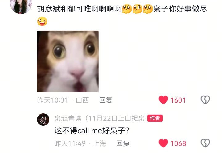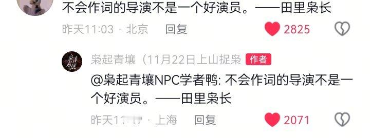 “枭起青壤NPC学者鸭:不会作词的导演不是一个好演员。一田里枭长”“这不得call me好枭子?”“一小段就这么好听?是谁故意掉进床缝循环100次我不说”“全能艺人田田土里 导演作词手拿把掐 玩转表演技能开挂 出手就是legend 级别 反转魅力等你发现一起解锁更多可能吧”“包用心的”“来咯来咯~枭学生请上车一”“好之妙之用心之,11月22日品鉴之”“燥候一个狂犬狂卷”“十分的喜一-!!不对”“浙江来了个老衲”“这么萌还说啥呢,青壤送你们了”“这不得call me好枭子?”…枭好活跃 哈哈哈