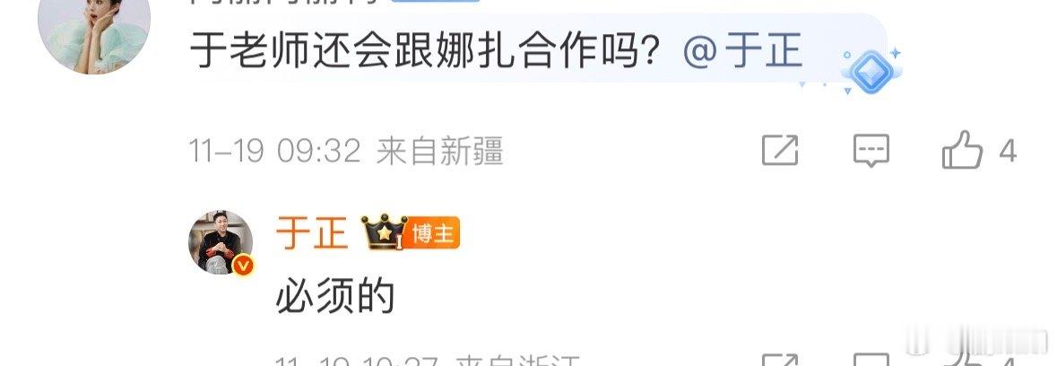 网友问于正“还会跟娜扎合作吗”,于正回“必须的”,这俩要是真合作,不知道这次会是啥题材,还挺让人期待的。