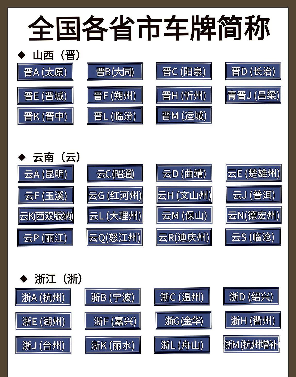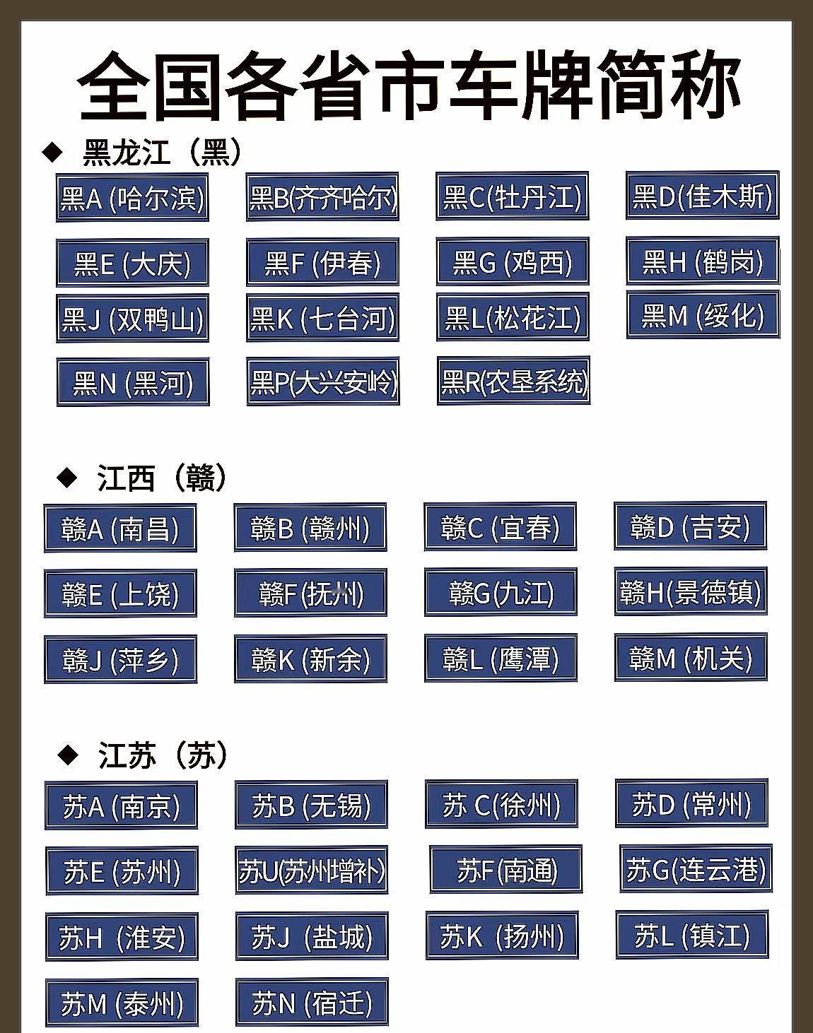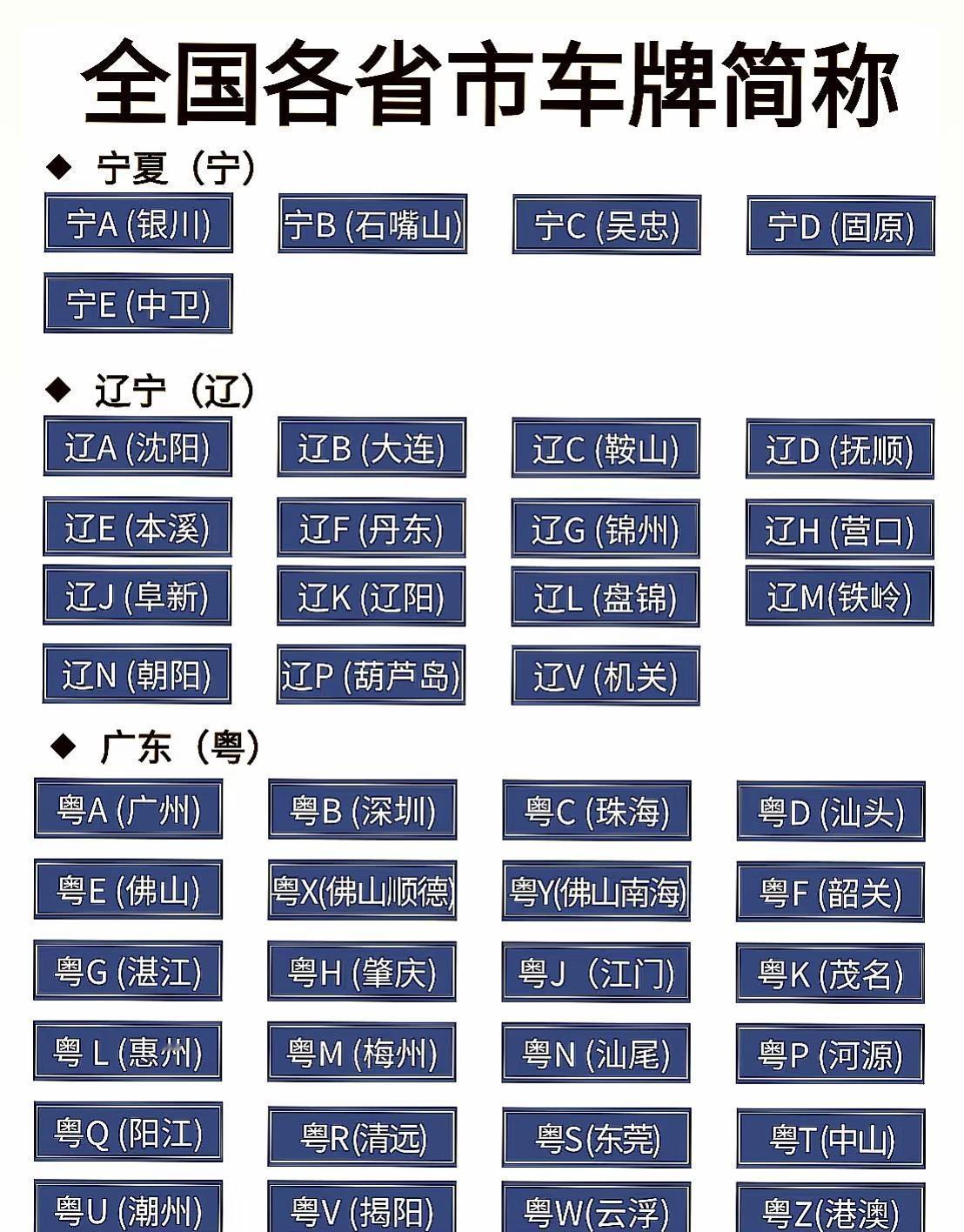 一次搞懂!各省市车牌字母命名规律 💡哈喽呀,我是车圈老炮儿菜哥,在汽车行业摸爬滚打多年啦,汽车那些事儿,我给你说明白~ 👉咱很多新手朋友买了车之后,头一件大事就是上牌。可好多人都迷糊,车牌数字前面那简称到底啥意思啊?出去旅游,看到各地车牌简称五花八门,这车牌命名到底有没有规律呢?今天菜哥用10张图,给大家讲讲各省市车牌那些事儿。 🚦车牌命名规律 1️⃣前面的“粤”“鲁”“津”这些,一般就是省份的简称啦。“粤”代表广东,“鲁”代表山东,“津”代表天津。省份简称后面跟着的字母A、B、C、D,通常代表这个省份里不同的市,而且“A”基本都是省会城市。就像“粤A”代表广州,“鲁A”代表济南。 2️⃣字母排序有门道 省份简称后面A、B、C、D、E的排序可不是瞎排的。既然A是省会,那B、C、D、E基本就是按照这个市在省内的综合实力来排的。所以啊,你瞅一眼车牌字母顺序,大概就能知道你所在的市在省内实力咋样啦。 3️⃣特殊字母有缘由 那些序列特别靠后的特殊字母,一般都有特殊原因。有的是因为某个市车牌太多了,前面的字母不够用,就加了些靠后的字母。还有就是“机关”等特定单位,也有专门代表的字母。这里我就不细说了✅ 🚙我是汽车爱好者菜哥,本期【各省市车牌简称】的分享就到这儿啦。咱们下期再见咯~ 车牌 宝藏车知识 新手买车攻略 车牌号码 北京车牌 买车 汽车知识 买车攻略 上牌