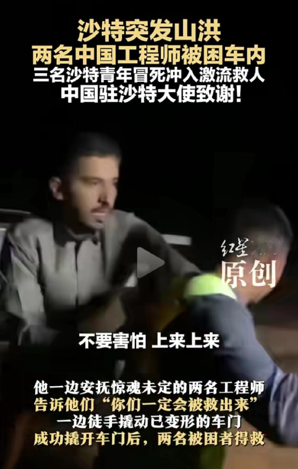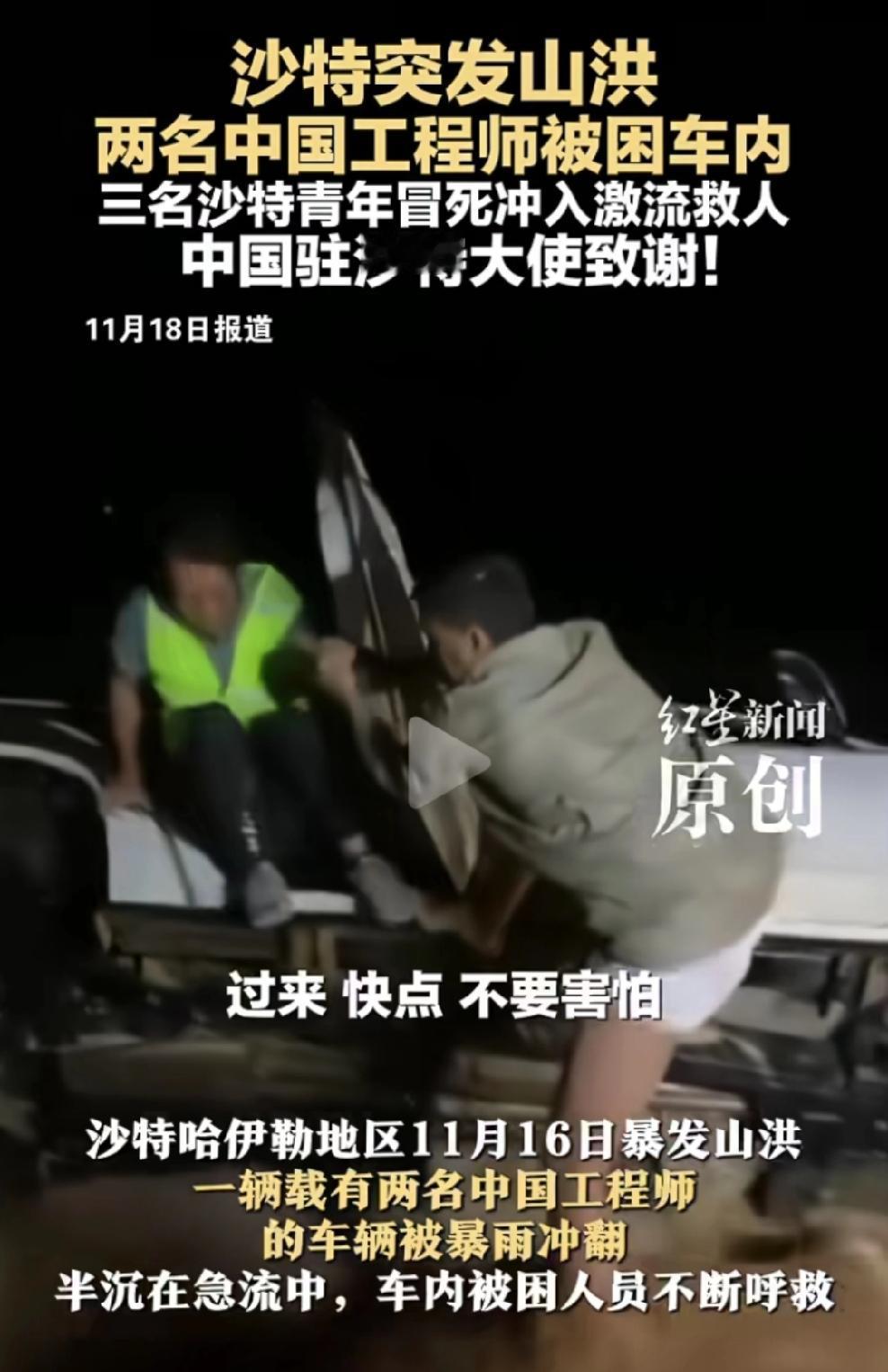 红星新闻报道:在11月16日,沙特突发山洪,两名中国工程师被困车内,湍急的水流随时都能将他们吞噬,生命危在旦夕。 就在这紧急关头,三名沙特青年冒死冲入激流。他们一边安抚惊魂未定的两名工程师,一边徒手去撬那已经变形的车门,一边说“你们一定会被救出来的”。 最终,车门成功被撬开,两名被困工程师得救了。中国驻沙特大使对此致谢和称赞!也让中沙友谊在这场救援中熠熠生辉!为他们的勇敢和善良点赞!