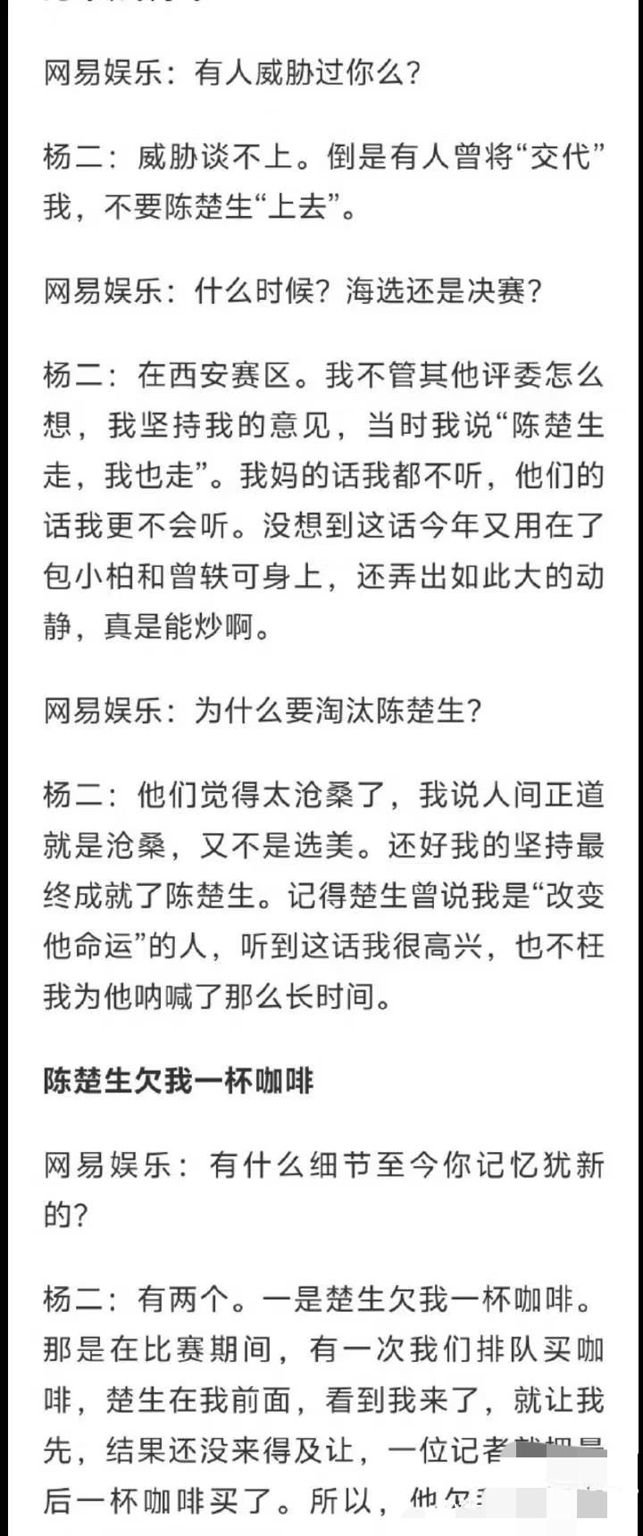 陈楚生从来都不是顺风局,快男时曾被黑幕差点拿下。 这是快男时期评委杨二车娜姆爆出的料。 她说她在当评委期间,曾被开小会要求拿下陈楚生。结果陈楚生一曲《姑娘》就把杨二车娜姆拿下了,她觉得不能因为陈楚生无背景、无亮点而被抹杀天分! 于是陈楚生就凭着自己的实力一路走到最后!