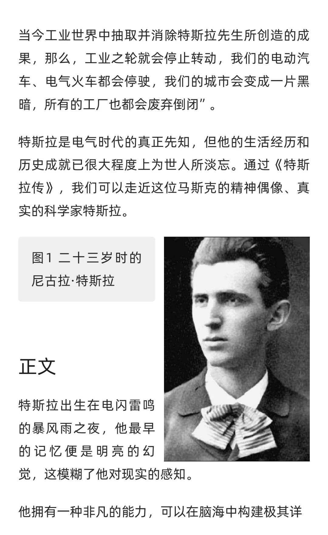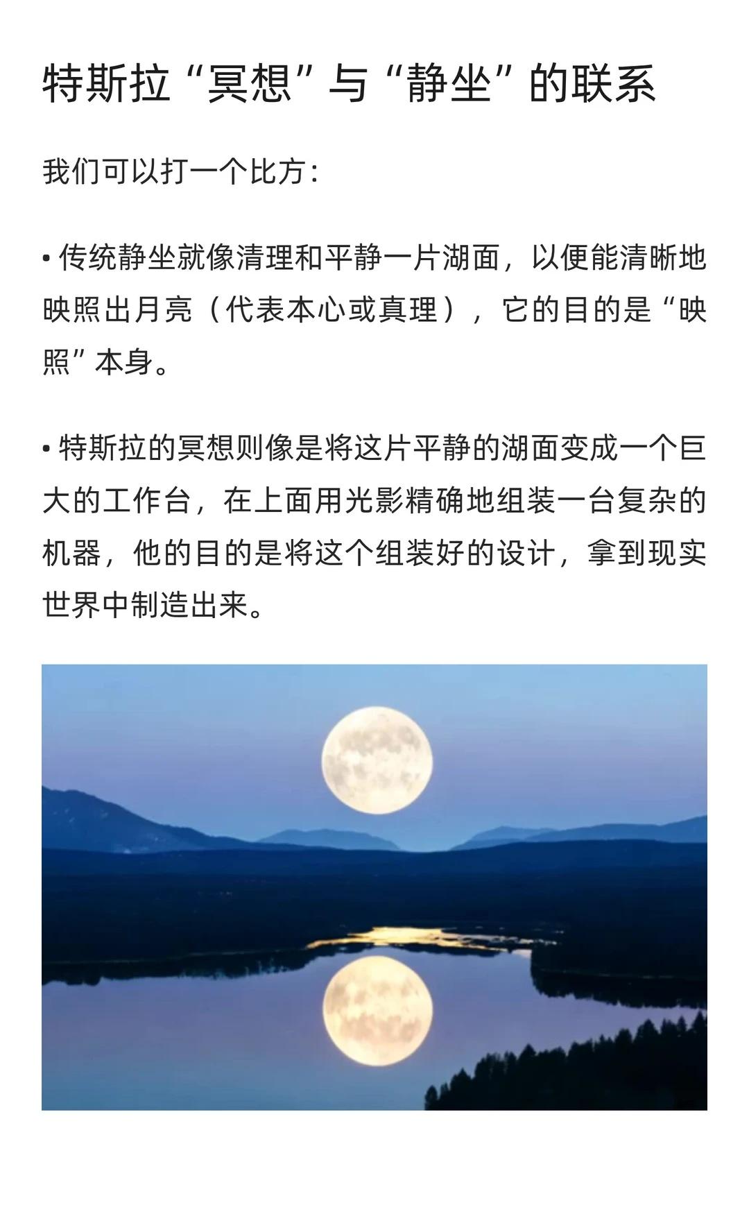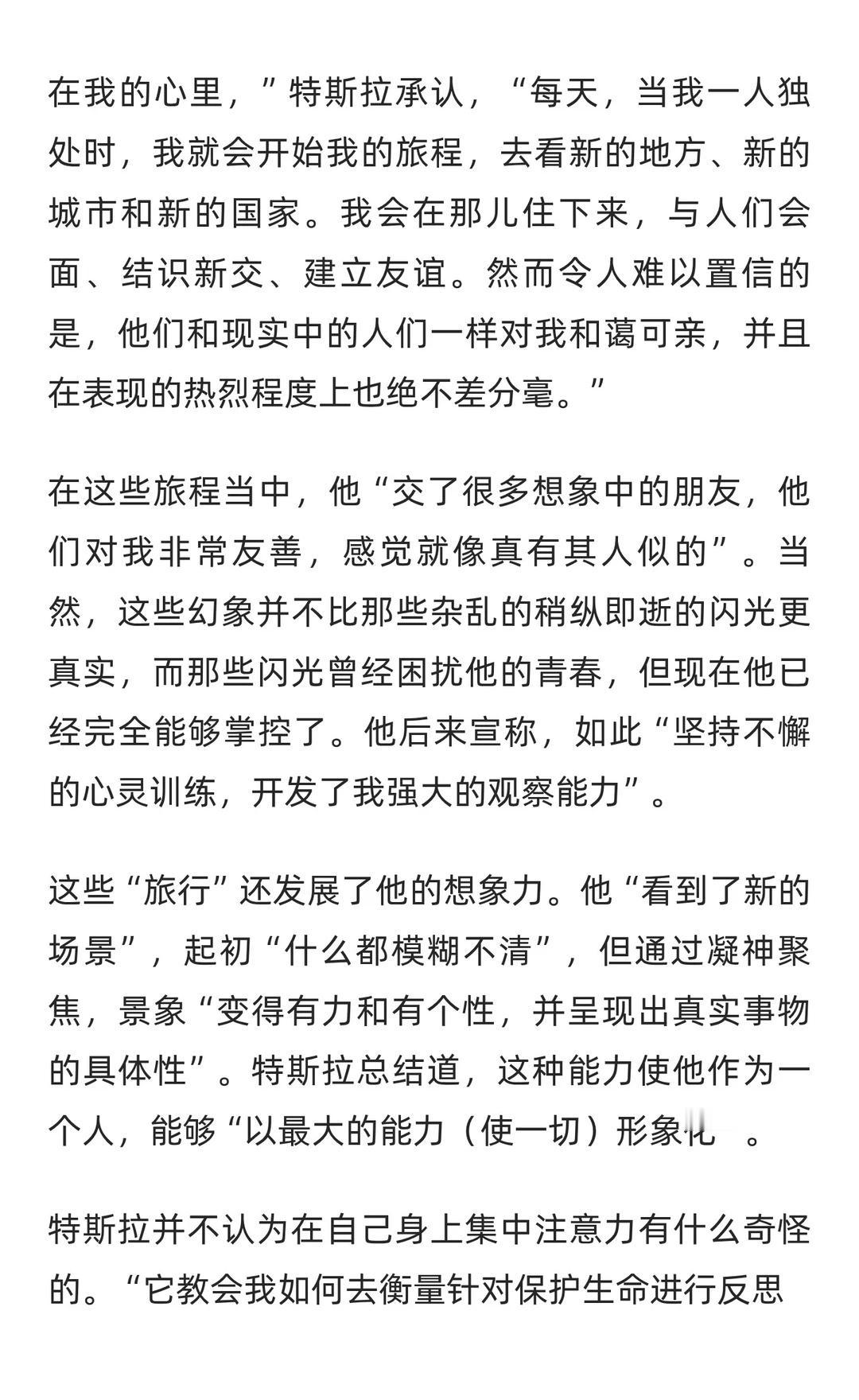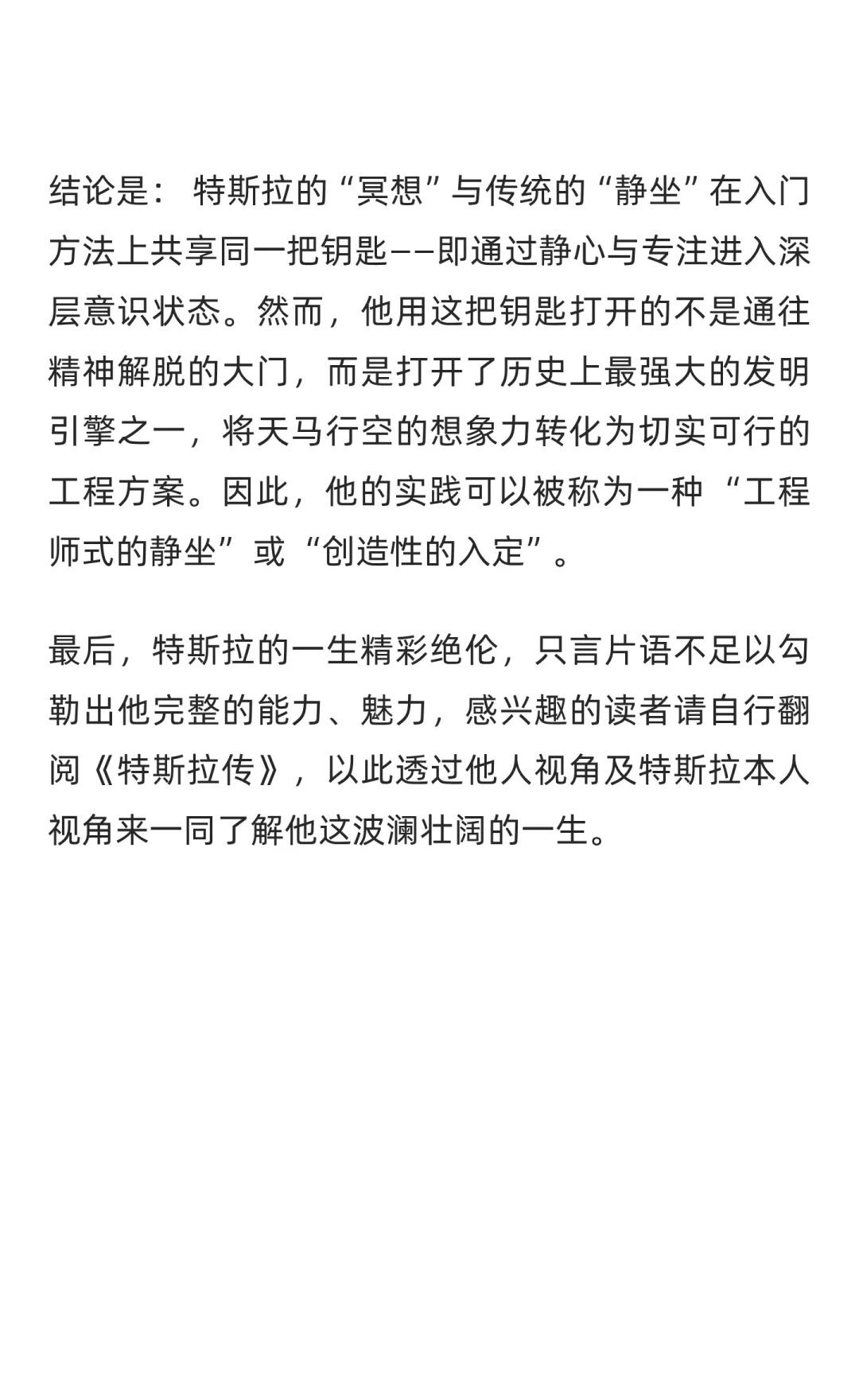 尼古拉·特斯拉对“冥想”的自述 尼古拉·特斯拉(Nikola Tesla)在世人眼中是一个古怪的天才,甚至是一个幻想家。 谷歌创始人拉里·佩奇(Larry Page)称赞他为“英雄”。埃隆·马斯克(Elon Musk)的电动汽车”“和公司也都以他的名字命名。 像佩奇和马斯克这样的企业家,本身已经是亿万富翁和才华横溢的发明家,却都把特斯拉尊为开启了现代电力、无线电和机器人时代的人。他们认为他是发明家中的发明家,是一代传奇。 特斯拉拥有一种非凡的能力,他可以在脑海中构建极其详细、几乎与现实无异的图像和模型。这个过程非常类似于一种深度的、有引导的冥想。 特斯拉总是独自探索他的各种想象。据他的一位姨母回忆,和亲戚们在一起的时候,“他总是喜欢一个人待着”。一大清早,特斯拉就出门了,“来到森林里静思。” 特斯拉并不认为在自己身上集中注意力有什么奇怪的。"它教会我如何意力有什么奇怪的。"它教会我如何去衡量针对保护生命进行反思所具有的难以估量的价值,"他这样想。他甚至批评大多数人”只会如此沉湎于对外部大千世界的思考“,以至于”完全不注意自己内心的波澜起伏“。 冥想 静思 想象 静坐 特斯拉 与伟大的灵魂对话 思维训练