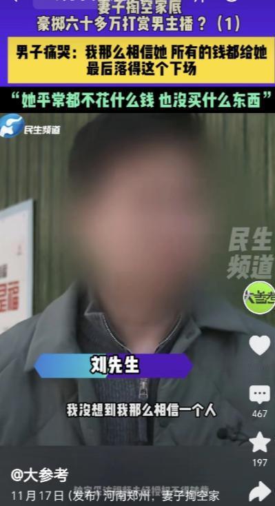 天都塌了!河南郑州,一男子结婚8年,省吃俭用存了116万,他交给妻子保管,谁知查账时发现,妻子账上只有3毛钱,男子这才知道,67万被妻子打赏给了男主播,其余的钱,妻子支支吾吾说不清楚,男子还发现,不但积蓄没了,妻子还借了80000元网贷,妻子:他叫我宝宝,忍不住上头了,男子大哭:我那么相信她,钱都给了她,却落得这样下场… 近期河南郑州这则新闻,看得我心里堵得慌,一个三十多岁的糙汉子,在镜头前哭得像个孩子,那委屈劲儿,隔着屏幕都能戳到人心里去。 这汉子姓刘,和妻子结婚八年,孩子都上小学了,为了让娘俩过得踏实,他把家里的重担全扛在自己肩上,常年在外地跑业务。 他住的出租屋一个月才三百块,冬天寒风顺着墙缝往里钻,夏天一场雨下来,盆碗都得拿出来接水,顿顿都是馒头咸菜,就为了能多省点钱寄回家。 八年啊,不是八天,他硬是凭着这股子拼劲,攒下了116万,这笔钱里有汗水,有委屈,更有对未来的盼头,孩子的学费,老人的医药费,都指着这笔钱打底。 他从没怀疑过妻子,每次发工资都一分不留地转过去,总觉得妻子在家带孩子不容易,钱放她那儿最安心。 可就在最近,他发现妻子不对劲了,以前还会跟他说说孩子的趣事,现在整天抱着手机,手指在屏幕上划个不停,对他却越来越冷淡。 直到有一次他随口提了句想看看存款,计划着给孩子报个兴趣班,妻子瞬间慌了神,支支吾吾找各种理由搪塞,这才让他起了疑心。 软磨硬泡了好几天,妻子才终于松了口,可说出的话像晴天霹雳,把刘先生劈得晕头转向,家里的钱没了。 116万不是小数目,就算日常开销大,也不可能凭空消失,刘先生逼着妻子查账单,这才看到了触目惊心的真相:67万都打赏给了一个男主播,剩下的钱妻子说不清去向,账户里就剩3毛钱,更荒唐的是,妻子还偷偷借了8万网贷,全砸进了直播间。 面对丈夫的质问,妻子低着头说,那主播会私下给她发消息,一口一个“宝宝”叫着,说“想宝宝一直陪着我”,直播PK时还会专门喊她帮忙拉票,每次听到那句“谢谢宝宝”,她就觉得浑身舒坦,忍不住想刷礼物支持。 其实这种套路,在直播圈里真不算新鲜,我之前就见过类似的案例,大连有个女子也是被主播的甜言蜜语哄着,先后打赏了130多万,连家里的东西都卖了凑钱。 这些主播很清楚,哪些粉丝容易“拿捏”,像刘先生的妻子这样常年在家带娃,社交圈子窄,很容易把主播的刻意讨好当成情感寄托。 一开始只是几十几百地刷,觉得是娱乐,可主播的话术不断升级,粉丝群里的攀比心理一催化,就慢慢刹不住车了,到最后甚至借网贷都要维持“榜一大姐”的面子。 最让人心疼的是刘先生,他在外头受的所有苦,都因为“为了家人”这四个字变得值得,可妻子的一句“忍不住上头”,就把他八年的心血毁得干干净净。 从法律上来说,这事儿其实有转机,《民法典》里明确说了,夫妻共同财产不能单方面挥霍,像这种大额打赏,刘先生完全可以起诉要回来。 就像大连那个案子,最后主播还是退了37万,不过要注意的是,平台通常会扣走一半分成,能追回来的是主播实际拿到的部分。 至于那8万网贷更不用愁,刘先生没签字也没追认,钱又没用于家庭开销,理应由妻子自己还。 不过比起钱,更难修复的是破碎的信任,一个家庭的根基,从来不是存款数字,而是互相体谅和责任。 这事儿也给所有人提了个醒,网络上的甜言蜜语再动听,也比不过身边人的真心相待,换作是你,遇到这种情况会怎么处理?