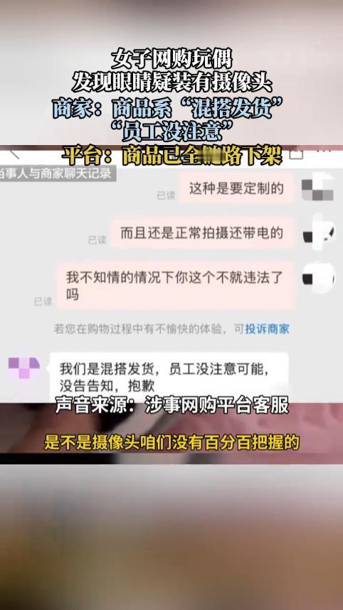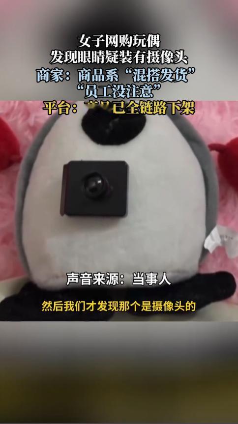 “必须严惩!”11月16日,广西贺州,一女子花47元,网购了一套毛绒玩偶,结果孩子抠玩偶的眼睛时,意外抠出来一个塑料物品,女子急忙拿过来检查,发现竟然是个摄像头!找商家反馈,对方表示是员工没注意发错了货。网友:可太刑了! 现在科技发展的十分迅速,然而,高科技在带来便利的同时,也可能沦为犯罪分子的作案工具,就比如针孔摄像头,它能拍到个人的隐私,然后被不法分子加以利用。 前几天,梁女士刷手机时,发现一家玩偶店卖的玩具非常便宜,20个才47块钱,平均下来一个才2块多,简直是白捡的一样,于是她便果断下单。 等到快递送到后,梁女士迫不及待的拆开包装,简单检查后,并没有发现破损的,于是就拿给孩子玩了。 令她没想到的是,孩子不小心抠掉了一个玩偶的眼睛,然后还在继续抠。梁女士刚准备责备孩子,也发现了蹊跷的地方,于是她拿来玩偶检查。 眼睛位置还有一个塑料的东西,梁女士费了好大一番力气才拆出来,结果竟是一个摄像头!幸亏发现的及时,要不然隐私就全暴露了。 梁女士去找商家理论,对方却表示应该是员工失误了,因为装有摄像头的款式需要定制,但是并不承认自己的做法违法。 网友看后表示,这家店真是太嚣张了,法律中有明文规定,不准售卖装有摄像头的玩具,必须严肃处置! 信息来源:《11月16日,广西贺州。女子网购玩具发现眼睛里疑似装有摄像头,商家称“商品系混搭发货,员工没注意”。平台:已全链路下架处理。》搜狐新闻