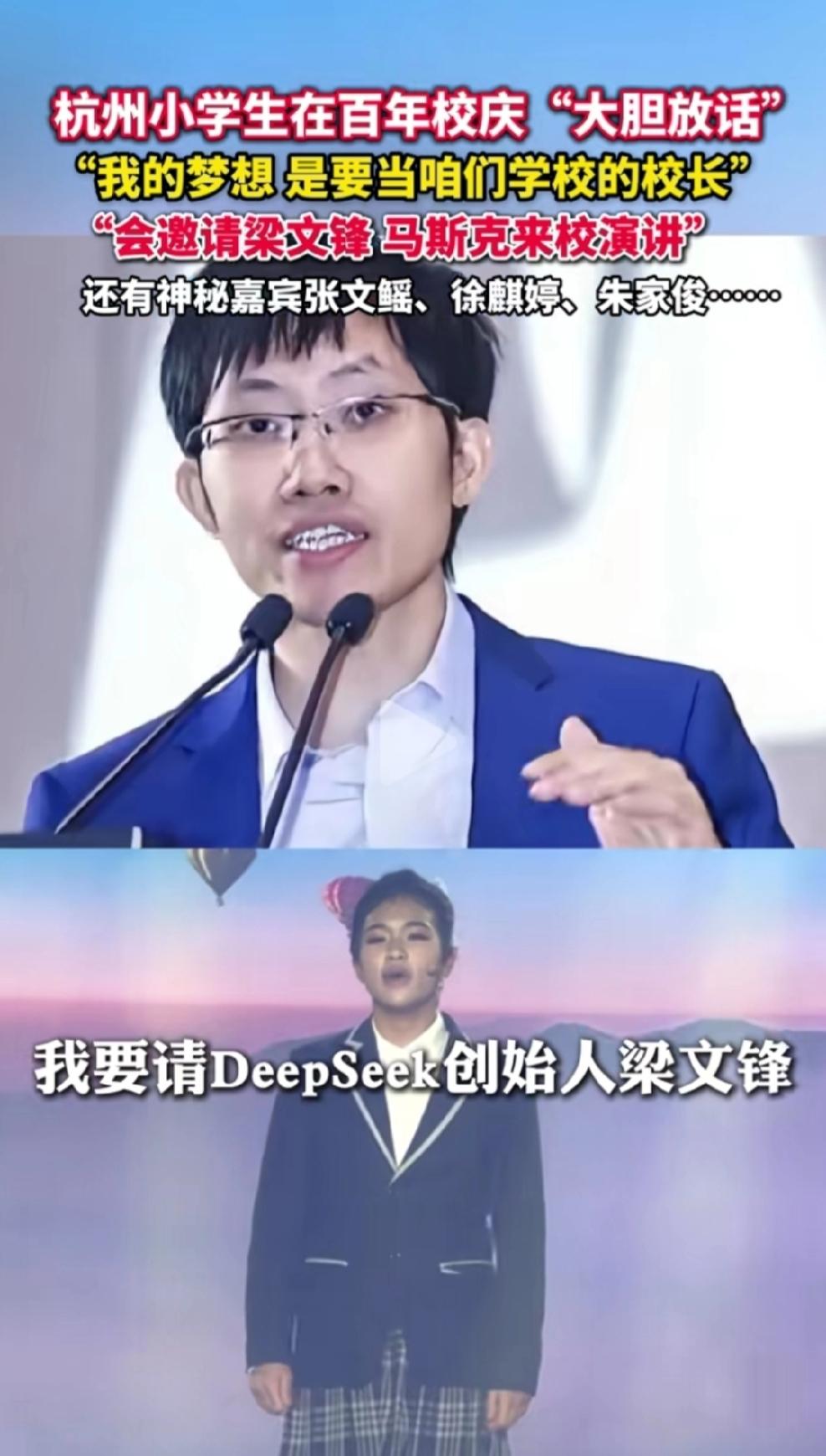 近日,在杭州一所学校的百年校庆上,一个小学生的发言直接把我整麻了!她大大方方地说自己的梦想是当校长,还列出了一串邀请名单。请 Deepseek 创始人梁文峰教编程,铜雕大师朱炳仁带做手工,甚至还要请马斯克来讲梦想落地,还有全球顶尖学家张文鳐、世界知名漫画家徐麒婷、诺贝尔医学奖获得者朱家俊…… 小小年纪有梦想是好事,可这梦想也太“炸裂”了吧! 现在的小孩都这么敢想敢说了吗?