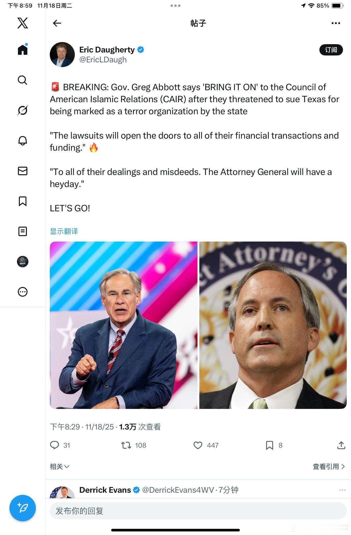 🚨💥突发消息:美国伊斯兰关系委员会(CAIR)威胁要起诉德州,因为德州把 CAIR 列为“恐怖组织”。结果德州州长格雷格·阿博特直接回一句:“放马过来!”阿博特表示,一旦进了法院,他们所有的资金往来、金流来源、各种交易和小动作,都会被全部摊在阳光下‼️他说:“司法部长到时候可要忙翻天了。”LET’S GO🔥