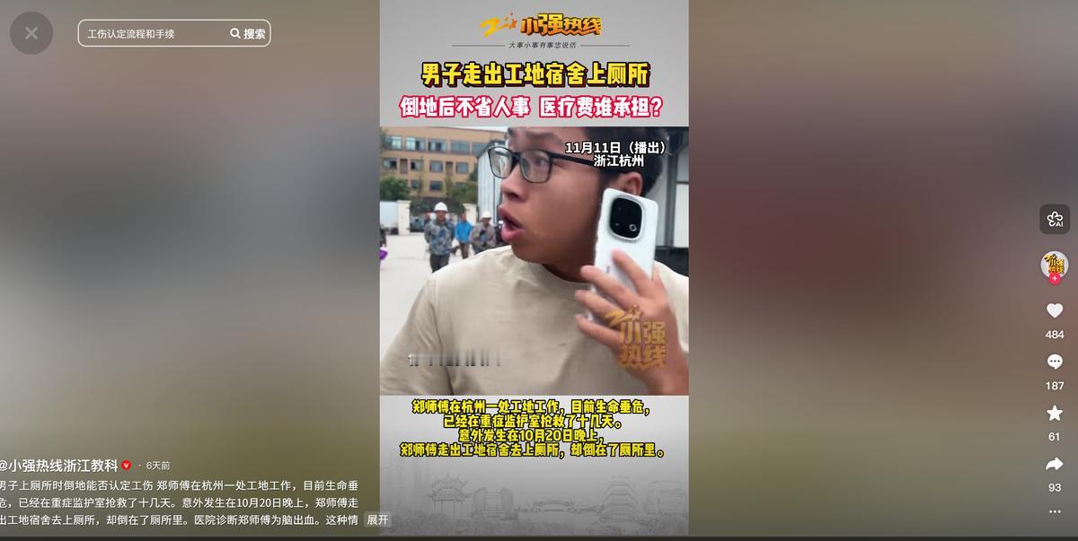 浙江,男子在一工地上班,夜里出宿舍上厕所,突然摔倒在厕所,送医院诊断为脑出血,工地垫付7万多元医药费后停止垫付,男子女婿找工地要说法,人是在工地厕所摔的,厕所连个防滑标识都没有,为啥不再支付医药费?没想到,工地负责人表示:这是你们个意外,又不是工伤,不属于保险赔偿范围内。问题来了,目前男子生命垂危,医药费该谁来掏? 浙江一个工地上发生的事儿,最近让人心里揪得慌,一个在工地上干活的男子老郑,好端端地在工地宿舍住着,夜里起夜上厕所,没想到出了意外,这一摔不仅把人摔进了 ICU,还牵扯出一堆关于医药费的麻烦事,到现在都没个准信。 老郑在工地上干的是体力活,平时住在工地安排的宿舍里,生活区和工作区离得不远,吃喝拉撒基本都在工地范围内,那天夜里大概十点来钟,老郑起夜去宿舍楼下的公共厕所,谁也没料到,刚走进厕所没多久,就听见 “咚” 的一声,等工友发现的时候,老郑已经倒在地上不省人事了。 工友们吓得不轻,赶紧七手八脚地把他抬起来找车送医院,一路上大家都盼着没事,可诊断结果出来,所有人都傻了,脑出血,医生说情况危急,必须立刻进 ICU 抢救,后续治疗费用更是个无底洞,工地方一开始态度还行,知道出事后陆续垫付了 7 万多块钱医药费,让家属先安心给老郑治病。 可没等家属松口气,工地方突然就停了垫付,这一下老郑的女婿戴先生彻底慌了神,老郑还在 ICU 里躺着,每天的医药费都是天文数字,家里本就不富裕,这 7 万多块钱很快就花得差不多了,后续的费用根本无力承担,戴先生只能一次次找工地负责人要说法,他觉得这事儿明摆着是工地的责任。 “人是在你们工地的厕所摔的啊!” 戴先生每次去都忍不住着急,他说自己后来去那个厕所看过,地面光秃秃的,连个 “小心地滑” 的防滑标识都没有。夜里厕所灯光又暗,地面可能因为清洁或者施工残留有些水渍,本来就容易打滑,工地连最基本的安全提醒都没有,这才导致老郑摔倒。现在人摔成了脑出血,生命垂危,工地怎么能说停付就停付? 可工地负责人的态度也很坚决,直接拒绝了戴先生的要求,他们说老郑摔倒纯属个人意外,算不上工伤,不在工伤保险的赔偿范围内,理由是事发在晚上,是老郑的休息时间,上厕所是纯粹的个人生活行为,既不是在工作时间,也不是在工作岗位上,跟工作没关系,所以工地没有义务继续垫付医药费。 这话让戴先生既愤怒又无奈,他反驳说宿舍和厕所都是工地提供的生活区,老郑是因为在工地干活才住在这里,怎么能说跟工地没关系?而且厕所存在明显的安全隐患,连防滑标识都没有,这本身就是工地安全保障没做到位,如果工地能多上点心,贴个标识,或者把地面处理得不那么滑,说不定这事儿就不会发生了。 可不管戴先生怎么说,工地方就是不肯松口,坚持不再垫付费用,现在最让人揪心的是老郑的情况,他已经在 ICU 里昏迷了十多天,瞳孔还处于散大状态,全靠呼吸机和各种仪器维持生命,能不能醒过来都是未知数,每天的医药费像流水一样花出去,家里已经掏空了积蓄,实在撑不下去了。 戴先生拿着一沓沓皱巴巴的缴费单,四处奔波求助,可事情一直没进展,相关部门那边也说,工伤保险的认定有明确规定,老郑这种情况确实不符合工伤认定的标准,没法走保险赔偿,这就让家属陷入了两难,人在工地出的事,工地有安全隐患,可就是没人愿意承担后续的医药费。 更让人心里不是滋味的是,听说老郑出事后没多久,那个没贴防滑标识的厕所墙上,就赶紧补上了一块新的 “小心地滑” 牌子,可这迟来的提醒,对躺在 ICU 里的老郑来说,一点用都没有,反而显得格外讽刺。 这事儿越想越让人难受,希望能有个合理的解决办法,别让为生活打拼的打工人寒了心,也别让躺在病床上的老郑因为没钱治病而耽误了最佳治疗时机,毕竟人命关天,总不能让一个小小的防滑标识,难住了该有的责任和担当。 (信息来源:小强热线)