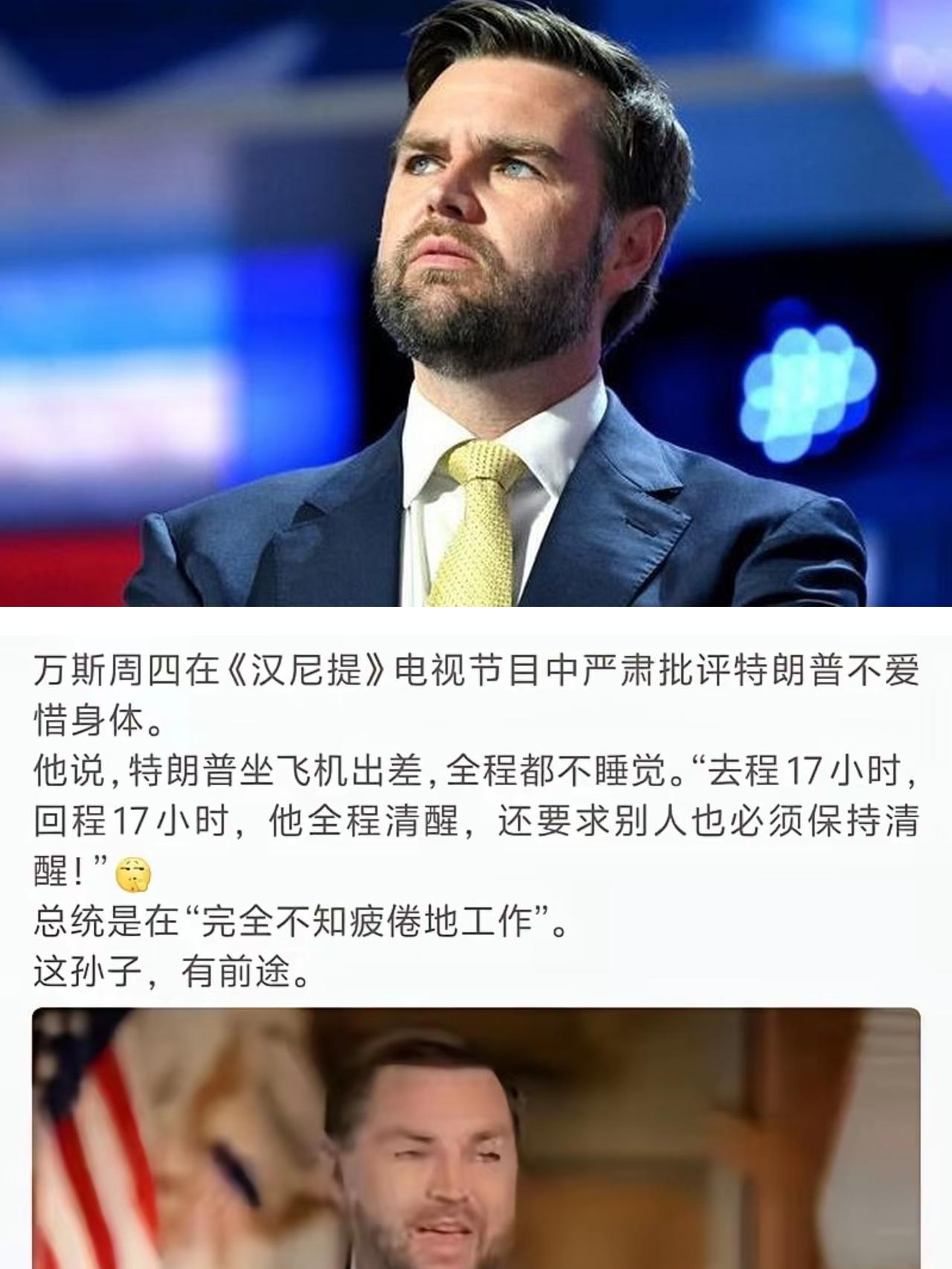 炉火纯青的批评艺术。万斯这厮什么时候学会的? 看不出五大三粗满脸络腮胡子的万斯有如此深厚的拍拍功夫。 给上司提意见的艺术,万斯可以说是炉火纯青。不像某些部门内部的生活会那样完全只上司放礼炮和对自己放空炮。 万斯列举出了具体事实。面对媒体万斯说,(年近八旬的)特朗普总统连续17小时乘专机往返途中从不睡觉或小盹休息。而且要求包括随行白宫发人维菜特等小年轻保持清醒,时时刻刻知道自己身上那沉甸甸的责任。 这样的总统,真可谓以身许国,鞠躬尽瘁,死而后已。