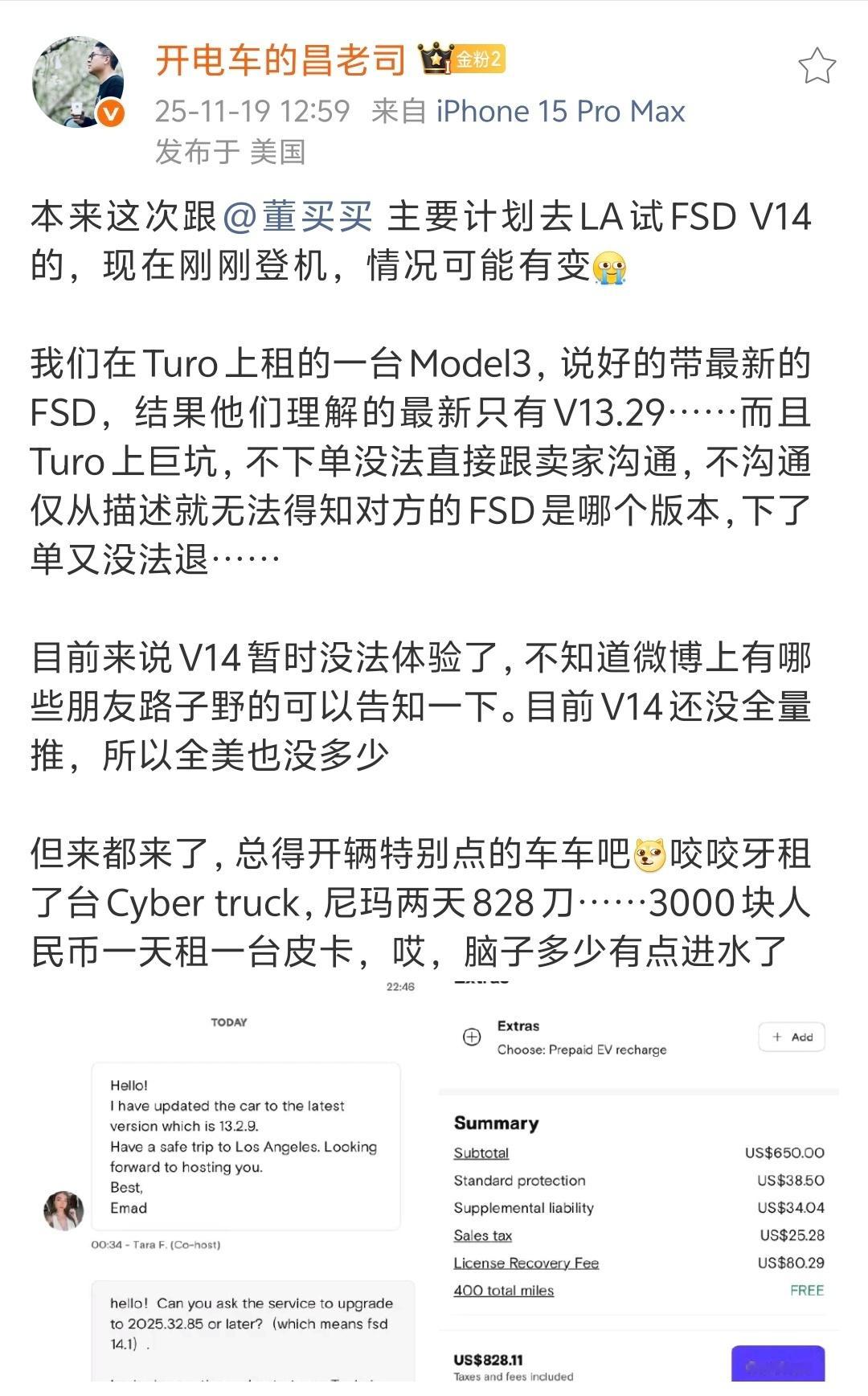 情况就是这么个情况,我要租FSD 14.1的Model Y,但是非早鸟用户没这个版本。Turo上暂时找不到合适的店家。主要是Turo这软件,你不下单,没法提前跟人聊(怕不走平台飞单),下单又是要付费,付费又是不可退所以体验还挺“不一样”的。目前我就先租了两台Cybertruck开两天,正好这车也没开过,看看后面有没有机会找到别的V14吧。另外,FSD V14.2会是一个批量推送的版本,估计明年,随便租都好找了。在LA的朋友们,要是有V14.1的车,愿意江湖救急,租给我用两天的,欢迎联系哇!