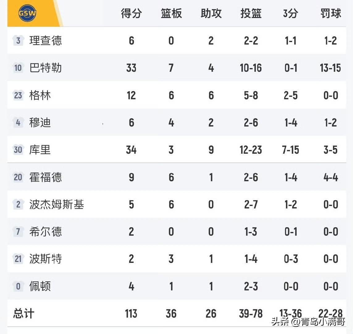 差点又打起来!!!库里&巴特勒合砍67分,勇士客场不敌魔术! 今天勇士继续客场之旅,3连胜的他们这次来到了奥兰多挑战魔术,勇士基本上属于全场落后的局面,最终他们也是以113-121不敌魔术。 勇士方面:库里拿下34+9,巴特勒33+7,格林12分,除他们三个外,勇士没有任何人再得分上双了, 魔术方面:全队6人双枪,首发5人都上双,贝恩23+6+5+5,表现的非常全能,替补布莱克也有21分入账,小瓦格纳18+8,卡特17+12。 魔术球员本场比赛发挥的非常出色,打出了他们自己应该有的特点,贝恩如果能一直有这样的表现魔术也不至于一直在附加赛徘徊。 勇士方面让波姐打了26分钟,只有5分入账,本来就没啥天赋的他在科尔这里得到了重用,可能也是库明加缺阵的原因,波姐还是需要控制下时间吧。 勇士队 金州勇士 勇士队阵容安排 勇士队阵容 西部勇士队 库里