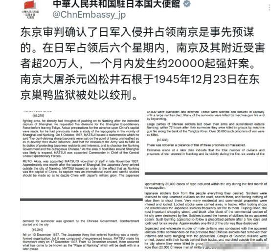 全翻出来了!日本军国主义者缺失的历史教育,中国大使馆翻出了东京大审判英文记录,日本军国主义干的那些惨无人道的事情,也该让日本人民知道了!11月19日,我们的驻日大使馆写到,东京审判确认了日军入侵并占领南京是事先预谋的。在日军占领后六个星期内,南京及其附近受害者超20万人,一个月内发生约20000起强奸案。   这些兽行突破了人类文明的底线,成为二战史上最黑暗的一页,而东京审判的记录,正是这些罪行最有力的见证。   作为南京大屠杀的元凶,松井石根最终在1945年12月23日于东京巢鸭监狱被处以绞刑。这一判决不仅是对他个人罪行的清算,更是国际社会对日本军国主义暴行的强烈谴责,彰显了正义或许会迟到,但绝不会缺席的真理。   中国大使馆此刻翻出这些珍贵的历史记录,绝非偶然为之,更不是要延续仇恨。其核心目的,是想让更多日本民众了解到被本国右翼势力刻意掩盖的历史真相。长久以来,日本国内总有一些势力试图美化侵略历史,否认南京大屠杀等暴行,甚至篡改教科书,让年轻一代对那段黑暗历史一无所知。   这些英文记录的曝光,为日本民众提供了一个了解真相的窗口。它们来自当年参与审判的国际机构,具有无可辩驳的权威性,能够打破日本右翼编织的历史谎言,让日本人民看清日本军国主义曾经的狰狞面目。毕竟,只有正视历史,才能避免悲剧重演。   历史不是任人打扮的小姑娘,每一个犯下的罪行都有迹可循。东京审判的记录就像一座警钟,时刻提醒着世人,忘记历史就意味着背叛。日本军国主义当年犯下的惨无人道的罪行,不是某些人一句“不存在”就能抹去的,无数受害者的血泪,早已将这些罪行深深烙印在历史的丰碑上。   对于中国而言,铭记历史不是为了仇恨,而是为了守护和平。我们翻出这些记录,是想让世界知道,中国人民珍惜当下的和平生活,但也绝不会忘记过去的苦难。同时,这也是对那些为了捍卫和平而牺牲的先烈们的告慰,让他们知道,他们用生命换来的和平,我们会誓死守护。   日本国内那些美化历史的势力,在铁一般的证据面前显得苍白无力。东京审判的英文记录就摆在那里,每一个字都在诉说着真相,每一页都在驳斥着谎言。他们越是试图掩盖,就越能凸显其内心的怯懦和对历史的不尊重。   希望日本民众能够通过这些记录,摆脱右翼势力的误导,真正了解那段历史的真相。只有当日本全社会都能正视历史,深刻反思军国主义的罪行,才能真正实现与邻国的和解,才能让东亚地区的和平稳定得到坚实的保障。   历史的车轮滚滚向前,但那些惨痛的教训必须永远铭记。中国驻日大使馆曝光东京审判英文记录的举动,是对历史负责,是对受害者负责,更是对人类文明的负责。让我们以史为鉴,共同守护来之不易的和平,不让南京大屠杀这样的悲剧再次在世界上任何一个角落上演。   这些记录不仅仅是纸张上的文字,更是历史的见证者,是正义的化身。它们提醒着我们,无论时间过去多久,正义都不会被遗忘,罪行都不会被赦免。日本军国主义者欠下的血债,虽然已经过去了几十年,但历史的账必须算清楚,这不仅是对受害者的交代,也是对未来的警示。   在当今这个和平与发展成为主题的时代,我们更需要正视历史,从历史中汲取教训。中国大使馆的这一举措,无疑为推动历史真相的传播做出了重要贡献,也为促进中日两国人民之间的相互理解搭建了一座桥梁。相信只要真相能够被更多人知晓,仇恨就会逐渐消解,和平就会更加稳固。
