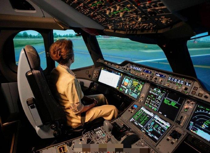 堪称完美把握复古风格的公主[赞] 这套米白色套装是30年前的单品, 安妮重新定义它的时尚度, 坐在A380试驾机舱内的她, 衬托地更为出挑,精神矍铄![耶]