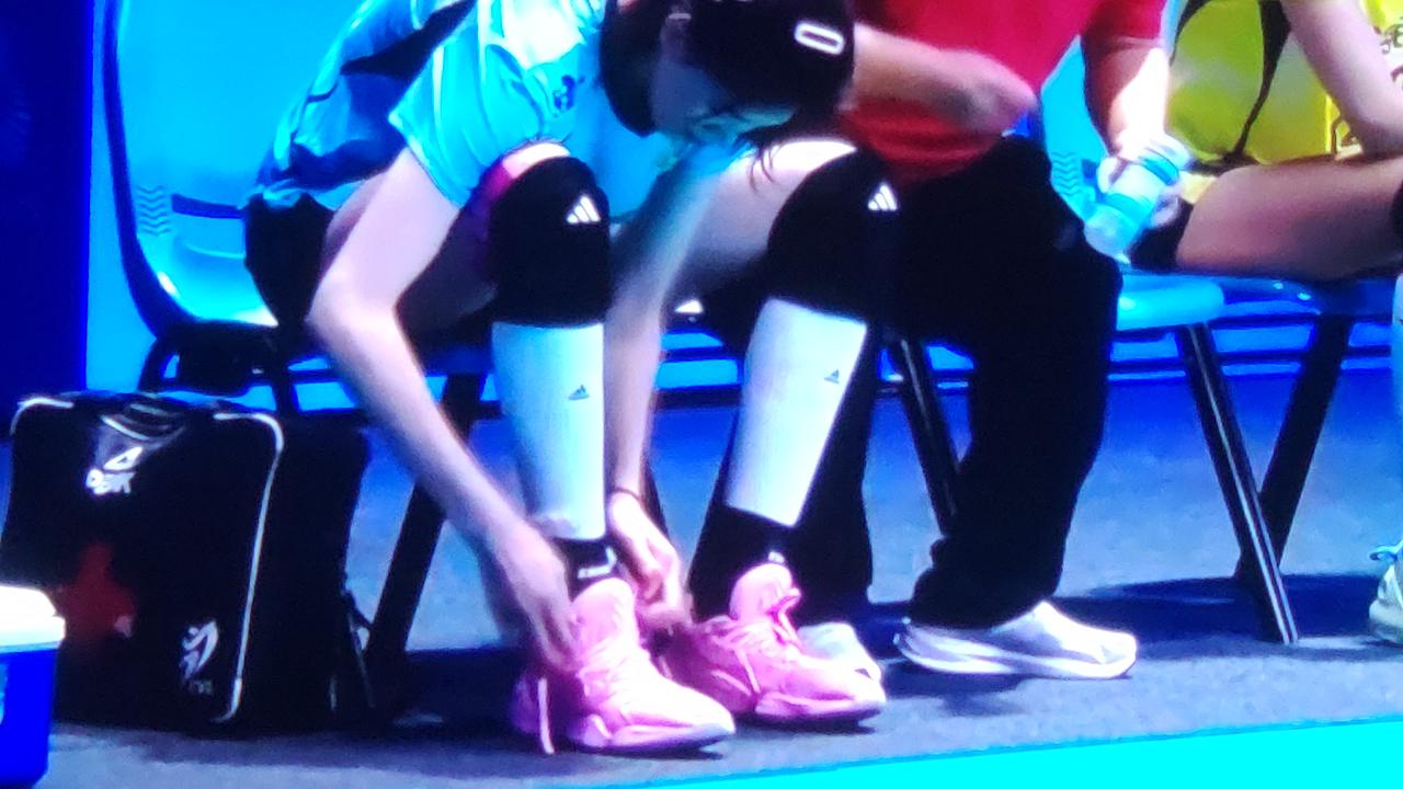 主攻李盈莹的脚第四局又出问题了 开局天津女排比分领先,河南女排暂停,妹妹李盈莹在场边脱下鞋正在系鞋带。 比赛开始了,主攻手李盈莹赶忙连跑带颠的去发球,结果没跑起来球随便扔了出去。主攻手李盈莹被替换下场了。 主攻手李盈莹坐在场边重新系鞋带。是不是鞋带松了,所以妹妹李盈莹重新系鞋带,脚应该没有问题吧! 真是让人担心啊!希望妹妹李盈莹不要受伤再出问题了,好好健康打完最后一场比赛。 这个意外的小插曲,希望是虚惊一场,希望主攻李盈莹健康没有问题。 现在天津女排场上三边攻是主攻手王艺竹,刘美君和杨艺。天津女排的全运会阵容和集训备战时候真是大变样啊!
