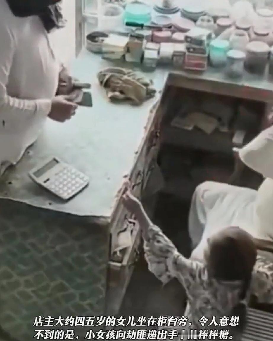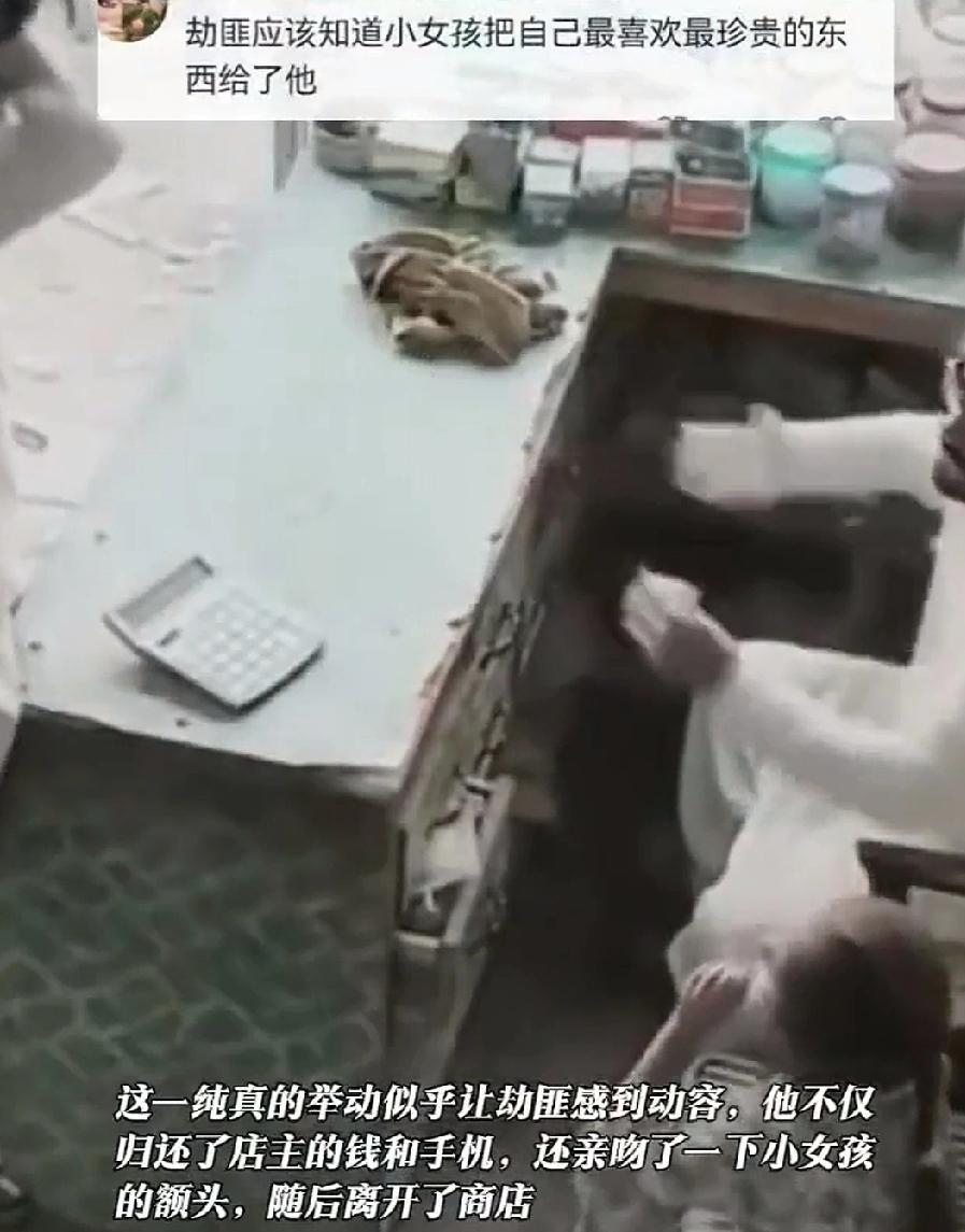 巴基斯坦男子手上缺钱了,他想实施抢劫,以度过难关。 男子用黑巾蒙住头,闯进一家小商店,用枪威逼店主交出钱和手机。 店主被吓坏了,战战兢兢把手机交给劫匪,然后打开钱柜取钱。 店主心里害怕,取钱动作很不利索。劫匪不耐烦,喝令他快点。 不可思议的一幕出现了。正在吃棒棒糖的店主女儿,她只有四五岁,把她认为最好的东西,棒棒糖递给了劫匪。 劫匪愣住了。他停了一会,把钱和手机还给了店主。抱起女童亲了亲额头,随后离开了商店。 善恶存乎于一念之间。男子为了钱财去抢劫,看到了女童的惊恐的目光,唤醒了心底的良知。男子或许在想,让这么小的孩子担惊受怕,真是罪过。我有手有脚,我可以干活、去挣钱。不能去做那些伤天害理的事。男子的善念战胜了作恶的念头。 巴基斯坦女童用棒棒糖阻止一场抢劫 劫匪与女童