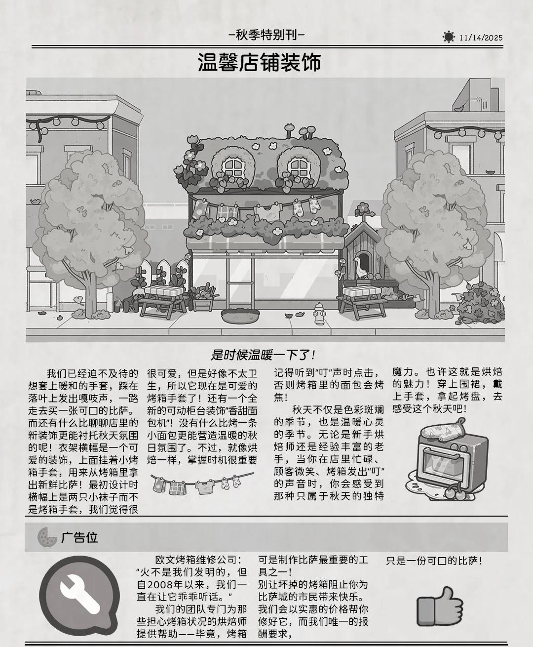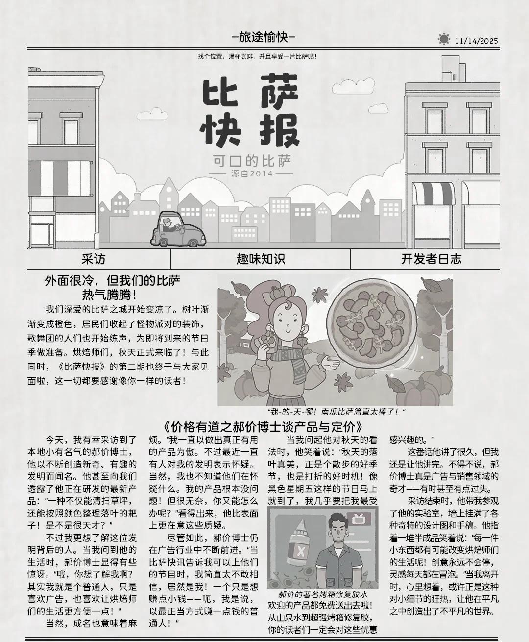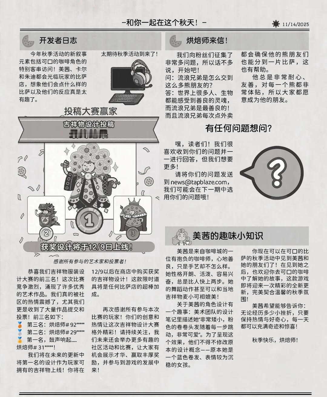 🗞️🍁 热门回归!🍂😄 欢迎回到《比萨快报》!这一期内容包括:全新装饰、开发者日志、访谈、关于即将到来的秋季活动,以及可口的咖啡中一位将会在活动期间造访比萨城的角色介绍! 😲 不要错过在全新秋季活动中为可口的比萨带来的这些趣味新内容! 📢别忘了,如果你对可口的比萨的世界有任何问题,欢迎发邮件给我们,你的提问还有机会出现在下一期《比萨快报》中!✉️ 可口的的比萨 模拟经营 游戏 宝藏游戏推荐