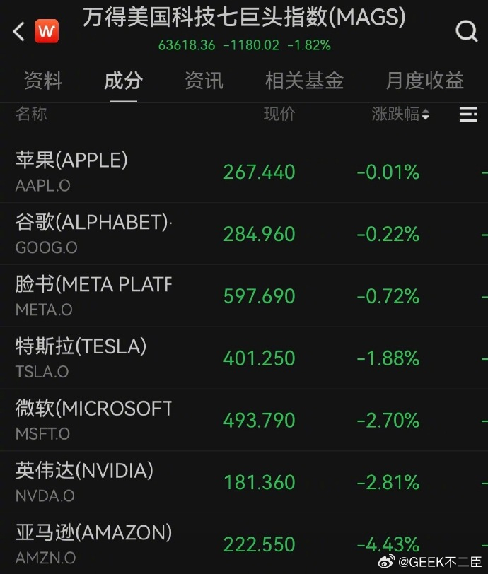 美东时间11月18日,美股三大指数集体下跌,纳指盘中跌幅一度接近2%,费城半导体指数一度跌超3%。截至收盘,纳指跌1.21%,道指跌1.07%,标普500指数跌0.83%,美股科技股七巨头指数大跌1.82%,费城半导体指数跌2.3%。