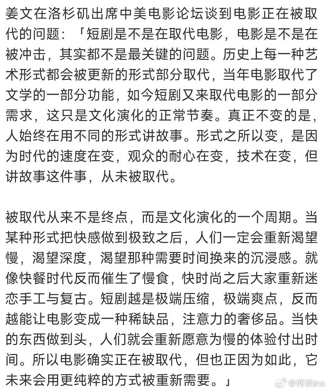 姜文说的这段话确实挺客观的,人类还在就需要故事,故事不变变的是形式,希望未来能产生更多质量好新锐导演的作品