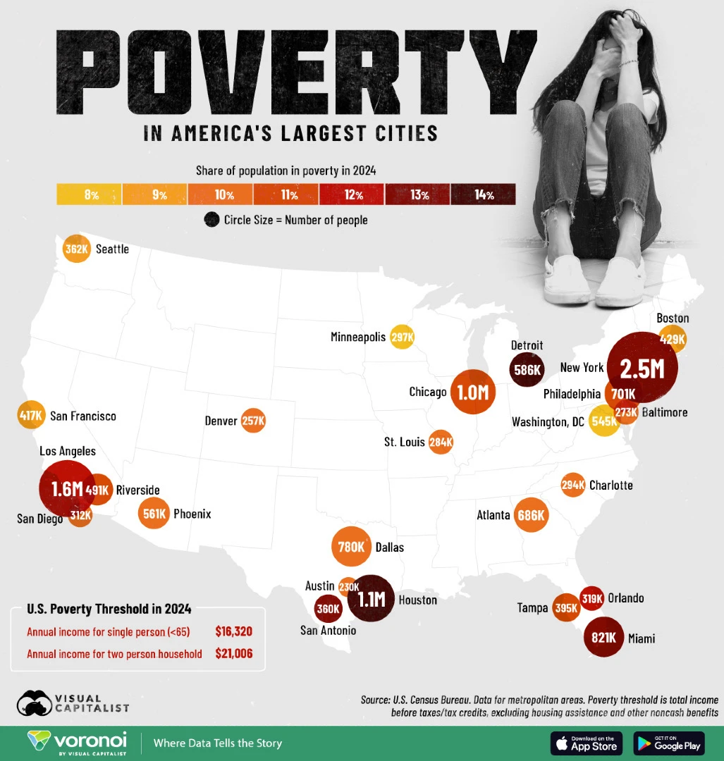 这张图展示了美国主要城市在 2024 年的贫困人口规模(圆圈大小)及贫困率区间(颜色深浅)。