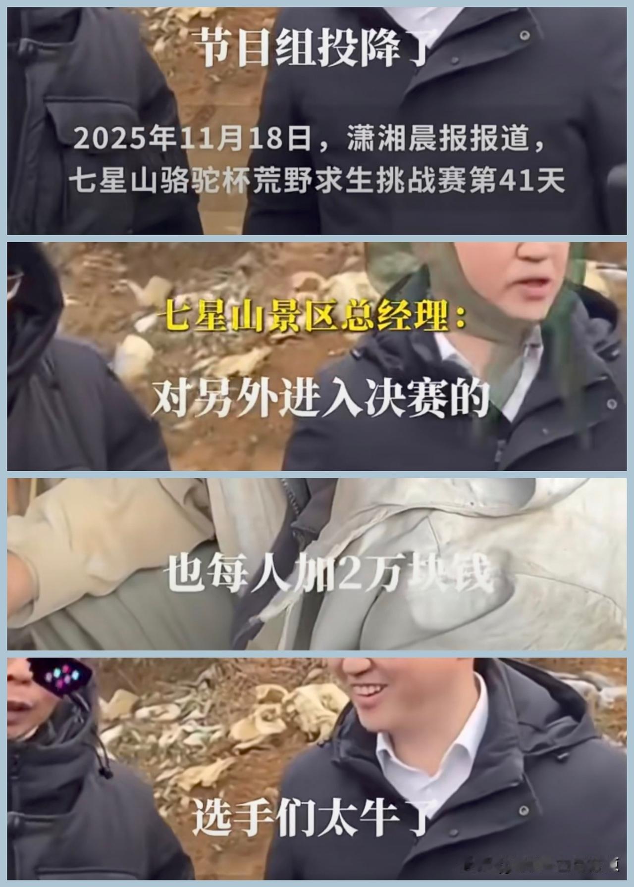 荒野求生挑战赛即将进入决赛圈 考虑环境原因提前结束 剩余14位全部入围(每人奖励2万元) 首先有请“冷美人”虽然她提前遗憾出场,但她是全场最佳MVP。 被邀请成为张家界文旅推馆,张家界七星山代言人“赛事主办方更是拿了3.86万”去医院进行慰问。 一场洗头的直播,引得数10万人围观。 当然,这有一部分原因也是因为他身为一个女性,却能坚持到现在淘汰众多男性的原因。 我们剩下的14位男性参赛选手也是十分不错。 他们那顽强的毅力,仿佛让我们回到了童年,原来童年时期一个英雄的梦。 在野外求生,搭建庇护所,寻找食物,偶遇猛兽,设计陷阱……等。 哪个男孩子曾经没有过这样一个荒野之梦?