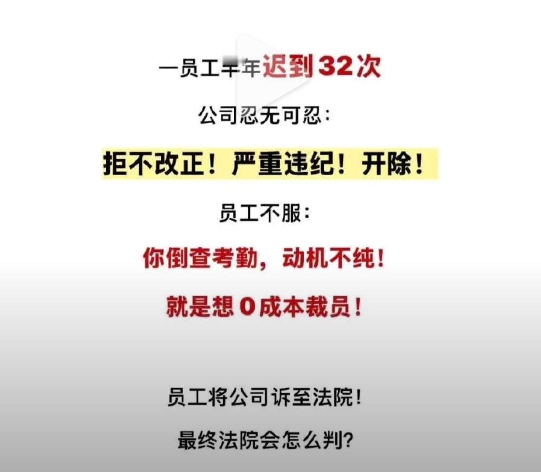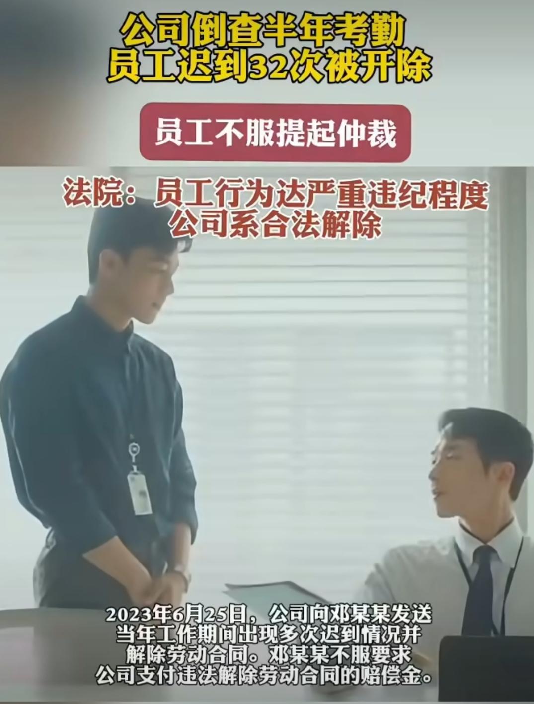 员工半年内迟到32次,被公司辞退。公司倒查半年的出勤记录,该员工在半年内有32次迟到记录,将此员工辞退,员工对公司处理不服,将公司起诉。 今日,法院对此事件作出判决,驳回了员工要求赔偿的诉求。 2020年邓某某入职某公司,与公司签订了三年的劳务合同,签订合同时邓某某明确清楚知晓公司的规章制度,可是在2023年初至2023年6月,邓某某连续多次迟到,该公司并没有直接辞退邓某某,而是先发了批评通报,要求整改,可是邓某某并没有在意,依然我行我素,随后被公司辞退,辞退后邓某某不服公司的决定,将公司告上法庭。 打工者与公司的问题一直是一个热门话题,这是资本与个人的的碰撞,大多数时候我们都会站在弱势群体的一方,可是这件事不得不说邓某某确实过分了,被辞退也是应该的。 工作就应该有个工作的样子,如果公司过分,侵占个人权益,那没问题,可以走诉讼,如果是个人问题,主观的,确实不应该。