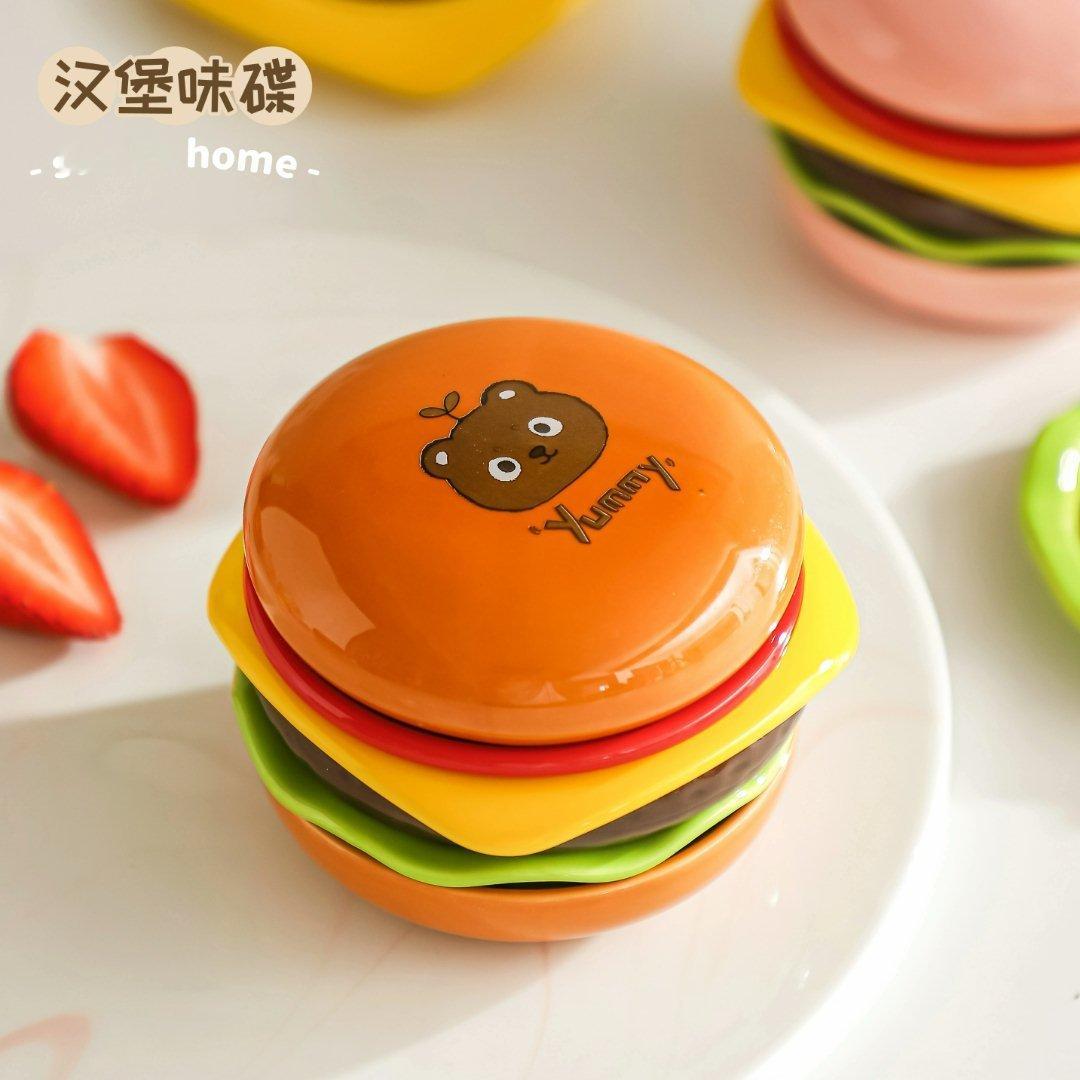 买了一套小碟子,感觉还挺不错的。釉下彩,汉堡造型,每一层都是可以用的碟子。汉堡胚