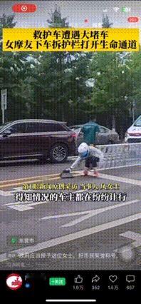 山东东营,因前方交通事故导致堵车,救护车出不来,一位女士上前拆掉护栏为救护车打开一条路。 这位小姐姐真是人美心善,智慧的孤勇者,对生命的敬重,生命至上,又有责任,又有办法。在特殊情况面前打破常规,为生命争取了一条路,这个小姐姐应该颁发好市民的奖励。 为打开生命通道的女骑士,还有逆行而上的救护车致敬!