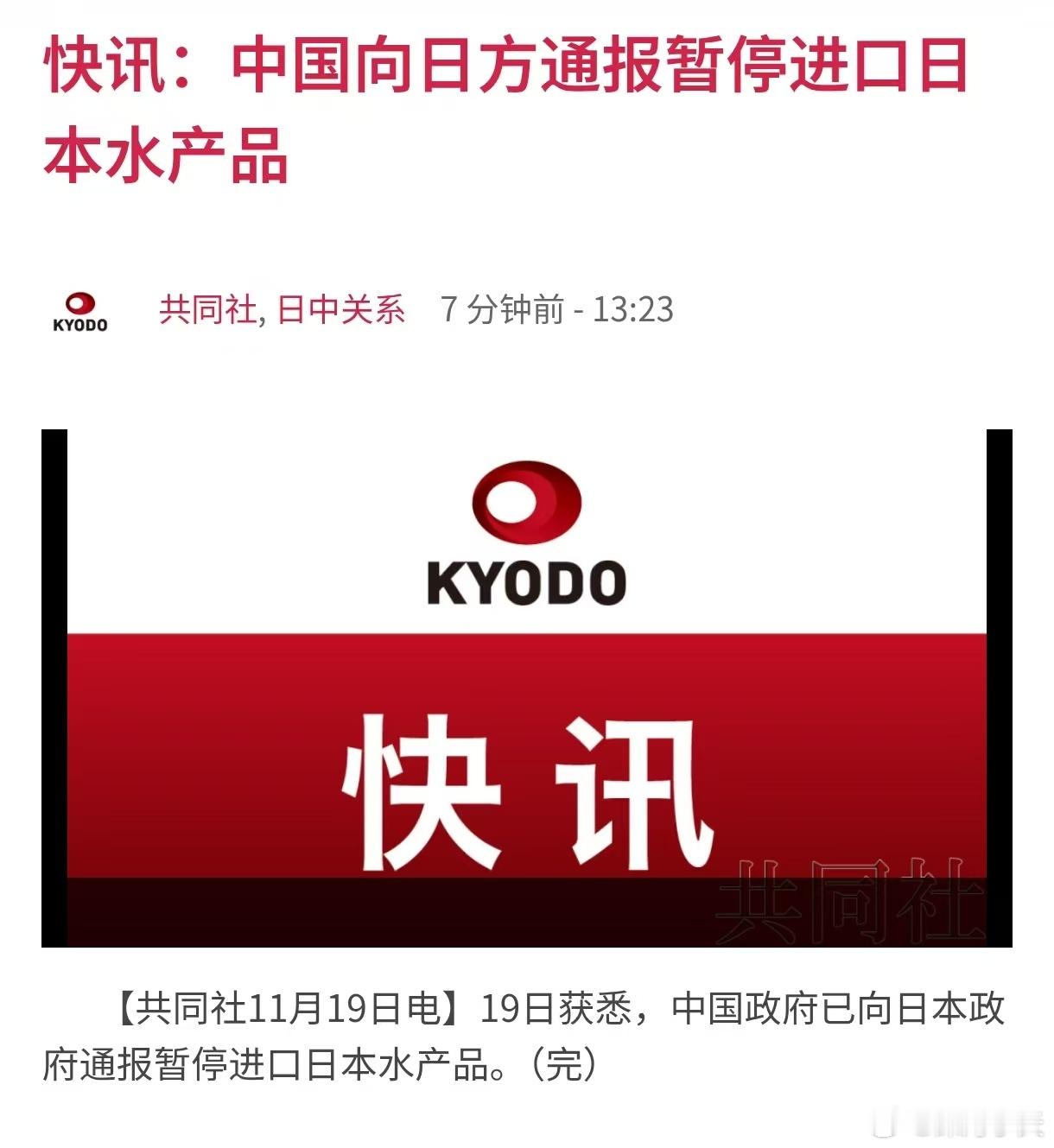 共同社:中国停止进口日本水产品根据《共同社》报导,中国政府19日通知日本政府,将停止进口日本出口的水产品。中国6月有条件恢复日本部分地区水产品进口,开放进口福岛县、群马县、栃木县、茨城县、宫城县、新潟县、长野县、埼玉县、东京都、千叶县等10个县除外的日本水产品。11月5日才刚有首批北海道6公吨冷冻扇贝自日本出货,10日还将有数百公斤盐腌海参输往中国。