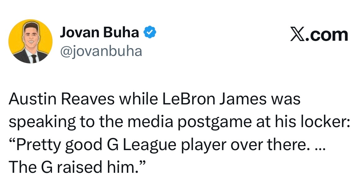 笑死我了哈哈哈哈🤣里夫斯老大实锤了😂詹姆斯赛后在更衣室接受媒体采访时,里夫斯在一旁打趣道:“那边那位G联盟出身的球员打得真不赖啊,果然是G联盟历练出来的狠角色。”