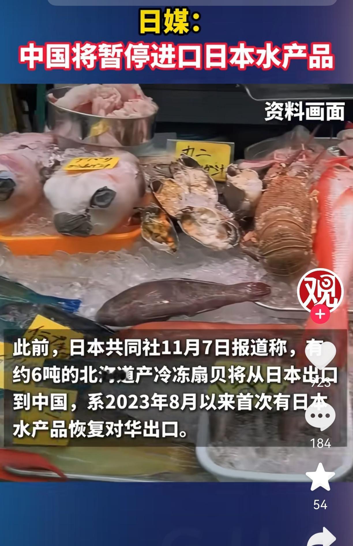 实话实说, 中国停购日本水产品这事儿,真的太让人大快人心! 2023年日本排核污染水,咱们直接停购,日本水产品对华出口从871亿日元暴跌九成多,渔民和企业日子难过得很;2025年6月刚有条件恢复,11月初才发了6吨北海道扇贝过来,现在又停,日本刚有的希望又没了。 这次停购不是突然的,一方面要评估福岛核处理水监测,另一方面可能和日本高层最近说的涉台言论有关,咱们得把好自己的关。 这哪是随便停? 都是为了我们国家的安全和立场,难道不该吗? 我觉得最好多方位卡他脖子,让她低头认错。