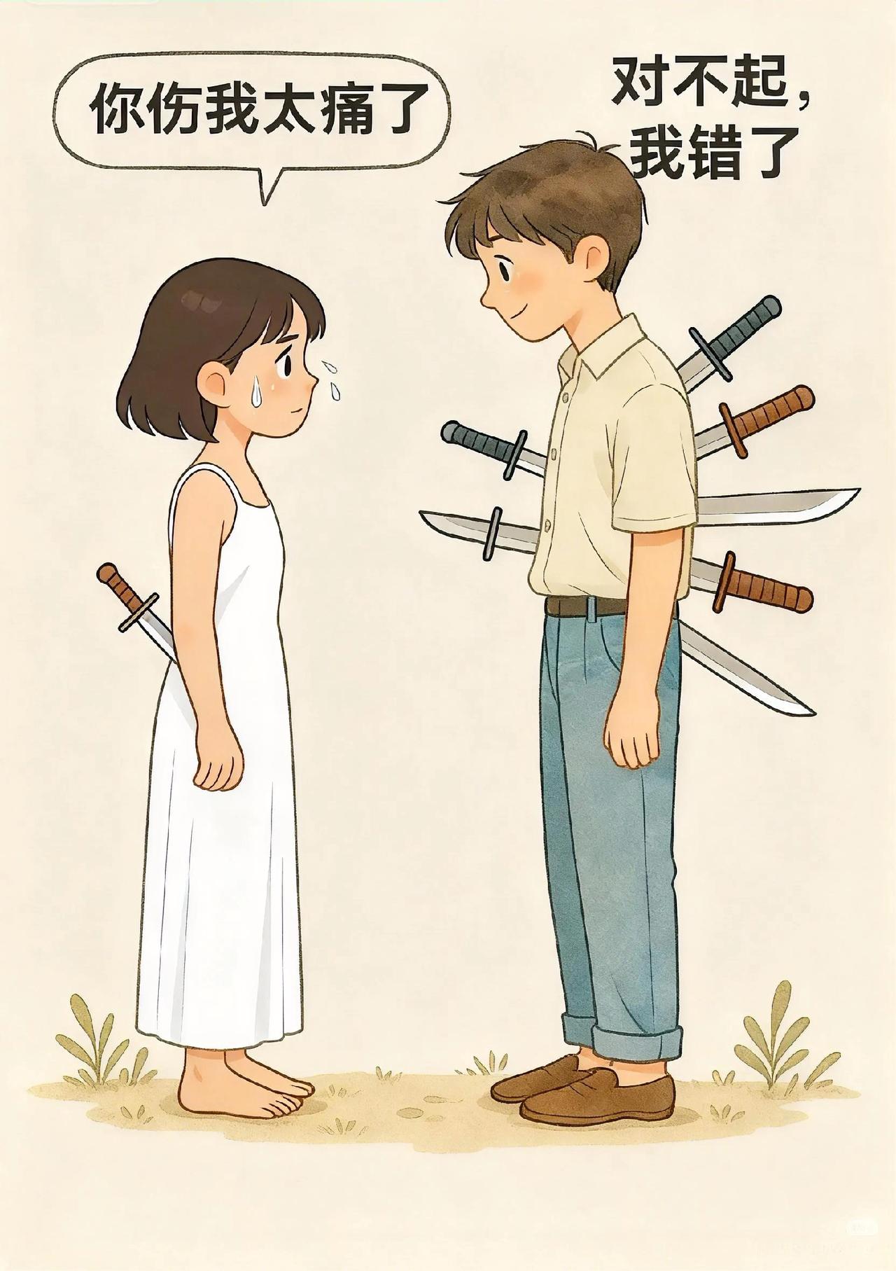 那个一直在说“对不起”的人… 在亲密关系里,有一种很残忍的场景: 受伤的人哭着说:“你伤我太痛了。” 而那个满身刀伤的人,却还在温柔地回应: “对不起,是我错了。” 我们以为谁哭得更大声,谁就是更痛的那一个。 但很多时候—— 真正被反复刺伤的人,是那个一直在道歉、一直在忍住不说话的人。 他们不反击、 不翻旧账、 不记仇、 不离开。 他们只是默默承受,把所有的情绪往内压,把刀都插在自己身上。 而刺向他们的人,反而会觉得: “我才是受害者,我才是那一个被伤的人。” 这就是心理学里的 镜像防御: 当一个人无法面对自己的情绪、羞耻、行为时, 他们会把“加害者”和“受害者”的角色对调, 把本来属于自己的责任丢给别人。 最后被误解的那个人,会像图里一样—— 满身鲜血,却还在反过来安慰伤害自己的人。 但真正成熟的关系不是这样。 成熟的关系是: 你刺痛我,我会说; 我刺痛你,我会负责。 不是一个人扛下所有的痛, 不是一个人撑着整个家, 不是一个人不断被误会、被颠倒角色、被当成敌人。 愿所有在亲密关系里负重前行的人,都能被看见。 愿那些满身伤痕却还温柔的人, 有一天能遇见真正愿意珍惜他们的人 —— 哪怕那个人,其实一直都在他们身边。