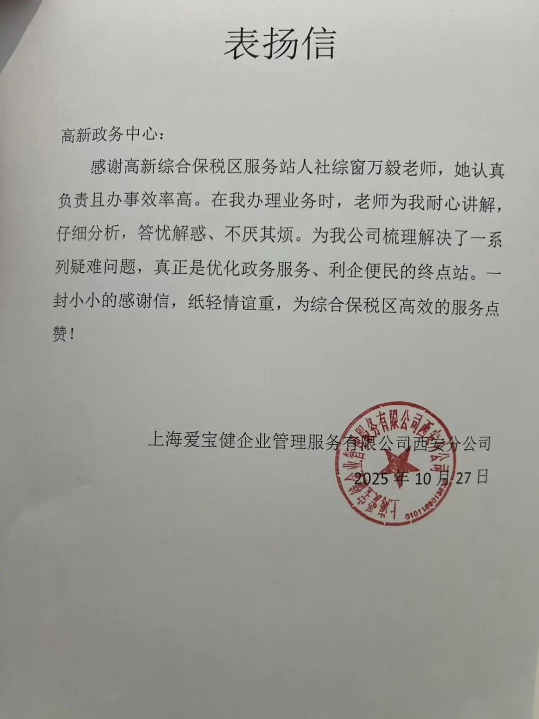 一面锦旗 十分认可 西安高新区政务服务连添新誉 近日,西安高新区政务服务大厅接连收到锦旗、感谢信。每一面锦旗背后,都有一个温暖的故事。 中国电子科技集团公司第二十研究所现代导航产业基地(二期)项目涉及规划变更和甲乙类库特消验收,面积情况较为复杂,且申报时间紧迫。了解情况后,工作人员积极协助项目单位梳理资料,针对项目设计单位负责人由于退休原因导致执业印章无法延续注册和用印的情况,工作人员主动对接行业监管部门,核实情况后共同商讨,快速提供了解决方案,确保项目顺利完成了竣工验收备案。随后,该项目单位向高新区行政审批服务局赠送锦旗以表感谢。 高新区内一企业因经营困境未能正常办理社保申报缴费,导致账户长期处于异常状态,随着经营形势好转,企业申请恢复医保账户,却因异常存续时间久、涉及人员信息繁杂遇阻。面对诉求,工作人员迅速响应,主动了解企业实际情况,将“一次性告知”细化为“清单式辅导”,逐项核对信息,耐心解答企业疑问。凭借扎实的业务功底与细致的服务态度,工作人员成功厘清问题脉络,用专业能力破解企业的“燃眉之急”。 上海爱宝健企业管理服务有限公司西安分公司是高新综保区内 一家韩资企业,近期该企业办理外籍员工社会保险参保及互免延期申请登记时,由于该员工签证丢失,部分资料不齐全,服务站工作人员积极联动外专部门及出入境工作人员,为该公司加急补证、容缺受理,确保各项业务顺利办结。该企业特致表扬信,对综合保税区服务站工作人员热情高效的服务予以高度评价。 高新区一企业在申请办理工伤失业账户合并业务时,因员工存在多个账户,无法正常参保。代办人通过电话咨询科创基金园政务服务站工作人员如何处理,在工作人员耐心解答其疑问,一次性告知办理流程及所需资料后,企业于当天顺利提交了合并手续。随后,企业对科创基金园政务服务站工作人员的服务态度与工作效率表示高度认可。 语短情长,一面锦旗传达的不只是感谢和认可,更是一份激励和鞭策。西安高新区将持续深化“高效办成一件事”,不断优化政务服务品质,千方百计服务好企业群众,为高质量发展提供更加坚实的服务保障。 (张楚翌 高新融媒记者 于秋瑾 通讯员 韩玉欣)