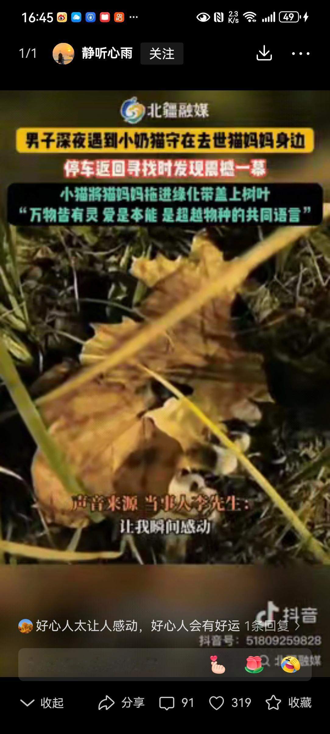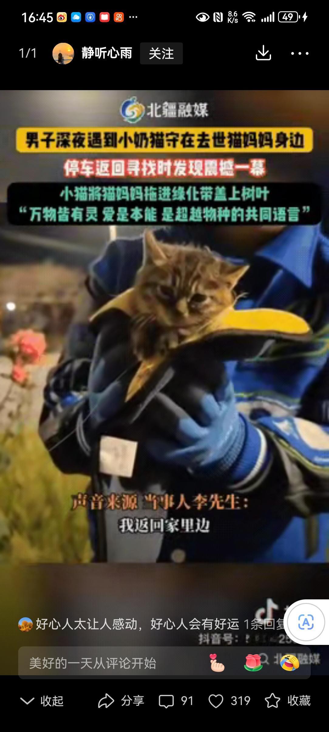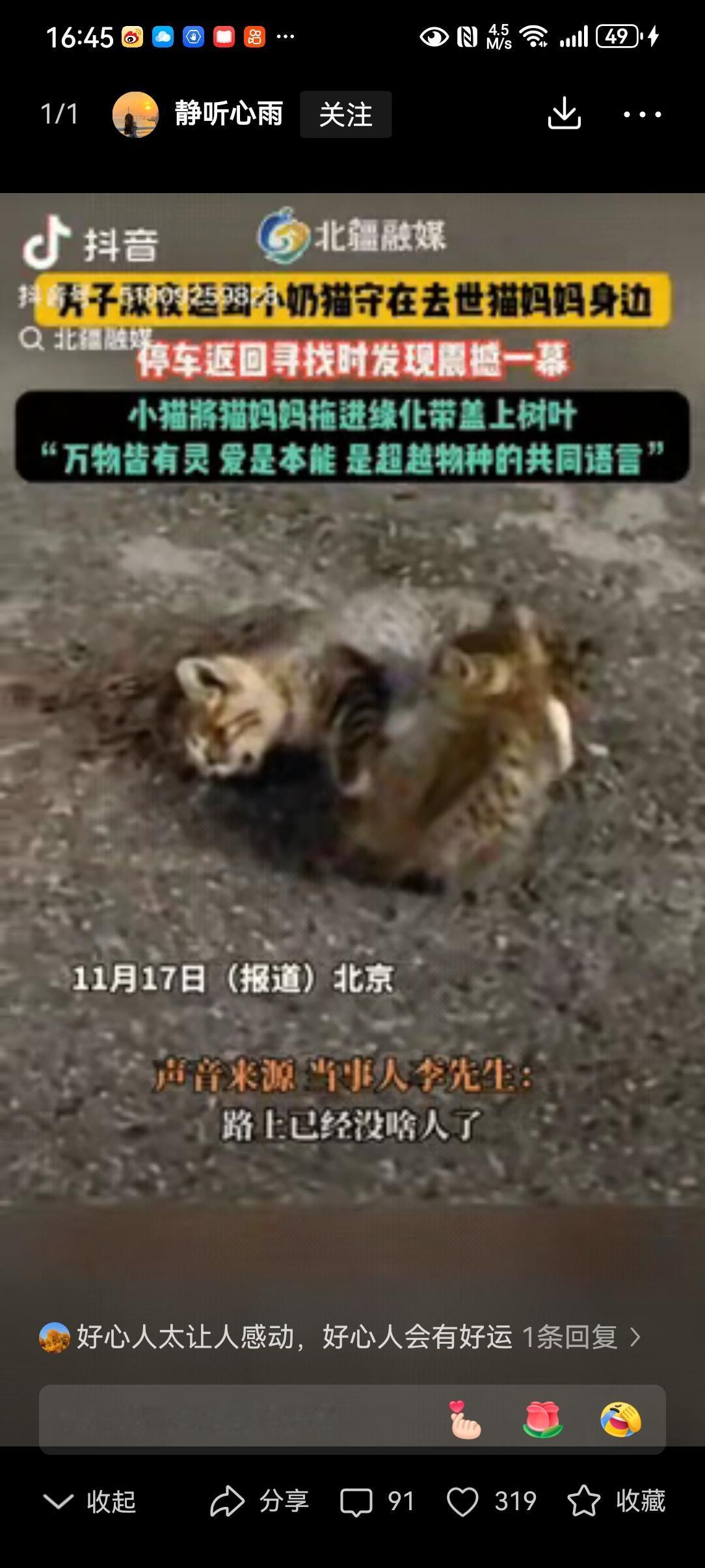 近日,北京,一男子深夜发现一只小奶猫守在去世的猫妈妈身边,当他停车返回去寻找时,却看到让人泪目的一幕,小猫已经将猫妈妈拖进绿化带,并盖上了树叶。 信息来源:北疆融媒 后半夜的北京街头,车灯扫过路面时,一声细弱的猫叫像根针,扎破了夜的沉寂。 男人刚结束十几个小时的夜班,困得眼皮打架,却还是下意识踩了刹车。 黑暗里,一团毛茸茸的小东西正扒着什么,走近了才看清,是只巴掌大的小奶猫,守着一具被车撞过的猫尸。 他心头发沉,转身想找个东西掩埋,回头的功夫,母子俩竟都没了踪影。 正纳闷是不是自己眼花,绿化带的灌木丛里,又飘出一声“喵呜”,带着哭腔似的。 拨开枝叶一看,他喉头一紧——小奶猫正用小爪子刨着土,把猫妈妈往草丛深处拖,还叼来几片枯叶,盖在妈妈身上。 动物学家说,许多生灵都有自己的“葬礼”,文鸟衔花,大象掘土,这只小猫,在用尽全力给妈妈一场体面的告别 。 他没惊动这小家伙,转身跑回家,拎了袋猫粮,又拉上妻子:“走,去救个小可怜。” 夫妻俩循着叫声找过去,小猫竟不躲闪,蹭了蹭男人的裤腿,乖乖跳进了他怀里。 到家后,他们给它取名“灵叶”,灵是通人性的灵,叶是那片遮尸的叶,也是劫后新生的叶。 有网友说,是小猫的孝打动了上苍,才让它在绝境中遇见善人。 我倒觉得,是人心的善,接住了生灵的情。 开车的朋友不妨多份留意,脚下轻一点刹车,可能就保住一条性命,护住一场牵挂。 万物有灵,众生有情。这只小猫失去了生母,却撞上了人间的暖。 愿每个流浪的小生命,都能遇到愿意为它停一停的人,都能拥有一个遮风挡雨的家。