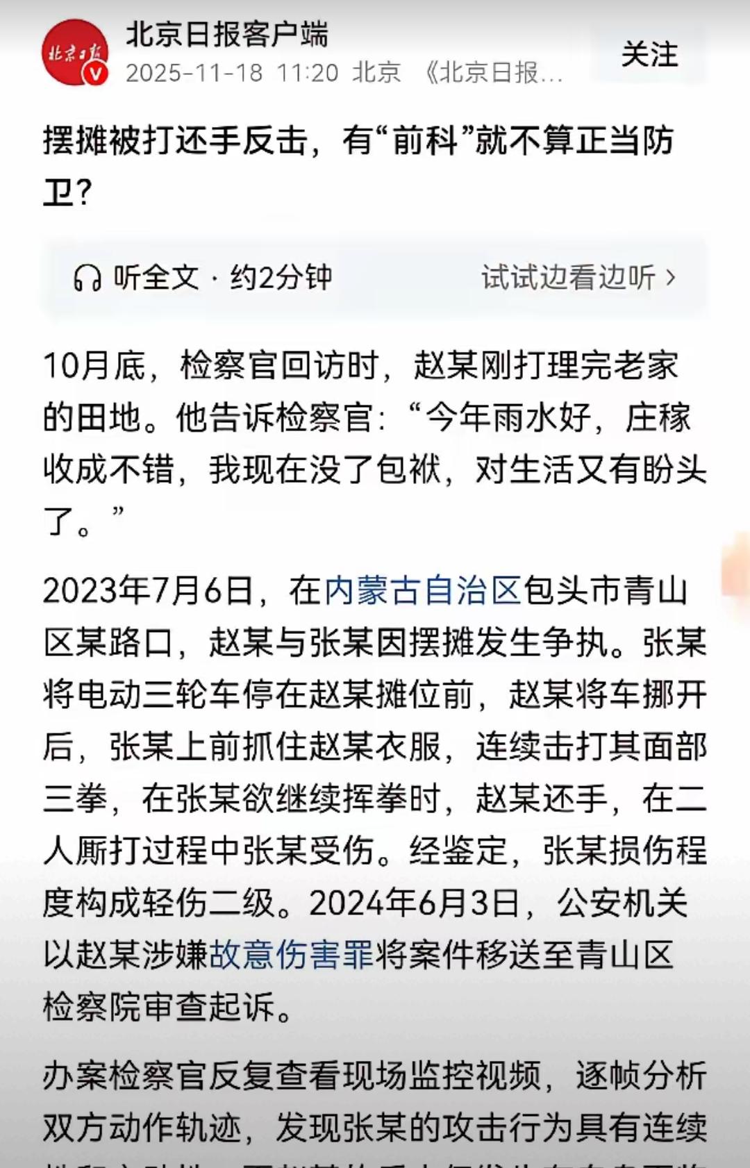 有前科就不能正当防卫了?包头这事儿真让人憋得慌! 刑满释放的赵某摆摊讨生活,张某把车堵人摊位还不挪,赵某推了下车,居然被揪住衣领连打三拳。都要继续动手了,赵某还手致对方轻伤,结果被民警按故意伤害罪移交检方。 凭啥有过前科,反击施暴者就成了“故意伤害”?难道刑满释放人员连保护自己的权利都没有了?幸好检方没只看标签,逐帧查监控、听证言,最终认定是正当防卫,作出不起诉决定。 法律面前人人平等,不能用“前科”给人贴标签、剥夺其合法防卫权。你觉得这事儿的关键在哪?如果是你遇到这种情况会怎么做?