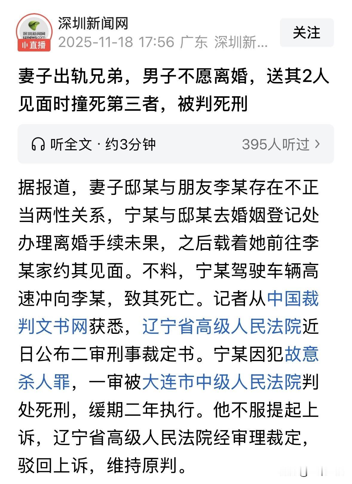 辽宁,一50岁男子发现,妻子竟和自己情同手足的好哥们有婚外情,他气得拉着妻子就去办离婚手续,却被告知有冷静期,出来后,男子开车带着妻子一路驶向朋友家,到了地方,他打电话把朋友叫了出来,接着一脚油门狠狠向朋友撞去,然而,这一撞,不仅让朋友死亡,也毁了男子的后半生。 宁某和李某本是多年的铁哥们儿,平时没事就约着喝酒聊天,感情好得像亲兄弟。 李某50岁,平时热心肠,邻里都夸他靠谱。可谁能想到,这份友情会因为一个女人而彻底破裂。 宁某的妻子邸某,是个普通家庭主妇,夫妻俩日子过得很安稳,然而,宁某无意中发现,邸某竟然和自己的兄弟李某有婚外情。 这让宁某越想越窝火,自己当兄弟的人,背地里却勾搭自己老婆,这不是明摆着欺负人吗? 宁某整天闷闷不乐,心里翻江倒海。邸某呢,可能也心虚,但两口子谁也没捅破窗户纸,日子就这么僵着。 时间到了2023年7月21号,宁某越想越憋屈,干脆带着全程懵圈的邸某去了婚姻登记处,打算办离婚手续。 可到了那儿,工作人员说现在有离婚冷静期,不能当天就办成。 宁某本来就不想离,他心里还念着旧情,觉得只要邸某回心转意,这日子还能过下去。 一听要等一个月,他更泄劲了,拉着邸某扭头就走。 登记处外头,太阳晒得人发晕,宁某坐进驾驶座,邸某默默钻进后排。 宁某心里那团火又烧起来了:要不是李某插一脚,哪会闹到这地步?他方向盘一打,油门一脚踩到底,车子直奔李某家开去。 这一路,宁某脸色铁青,一句话不说,邸某在后头缩着,可能也猜到要去干啥,但没敢吭声,心里七上八下的。 上午9点45分左右,宁某开着辆普通小客车,停在了李某家附近的马路边。他掏出手机给李某打电话,语气硬邦邦地说:老李,出来一下,有事找你。 电话那头,李某还懵着呢,以为兄弟有啥急事。 9点47分,李某推开自家大门走了出来,穿着拖鞋就往马路方向张望。 就在这时,宁某的车突然像发了疯似的,发动机轰地一声,车子高速冲了过去。 李某一看不对劲,吓得魂都飞了,他本能地往路南边躲,一脚踩进柏油路旁的土路上,想逃开这要命的冲撞。 可宁某哪肯放过?他方向盘猛地一转,车子直追过去,“嘭”一声巨响,把李某重重撞倒在地。 李某当场就不行了,头上、胸口、肚子都受了重伤,送医院也救不回来,就这么没了。 车里,邸某亲眼目睹了这一幕,吓得尖叫起来,急忙跳下车查看。 她摸着手机的手直哆嗦,先拨了120叫急救,又打110报警,嘴里语无伦次地说:出人命了,快来救人啊! 宁某撞完人,倒也没跑,他开着车去了附近的派出所自首,然而,此时他心砰砰跳,觉得心脏很不舒服,就在他人陪同下去了医院。 中午12点,公安在医院将宁某传送到案,调查很快展开。 警方调了监控录像、电话记录,还找了目击证人,一切都指向宁某是故意干的。他开车冲过去时,速度太快,还特意调整方向追撞,明显是要置李某于死地。 案子送到法院,法官拿出铁证,监控显示宁某的动作清清楚楚,电话记录证明他约了李某出来,法医鉴定也确认李某是撞死的。 法院根据这些事实,认定宁某犯了故意杀人罪。这可不是简单的交通事故,而是蓄谋杀人的重罪。 那么,从法律角度,怎么看待这件事? 《刑法》第232条规定:故意杀人的,处死刑、无期徒刑或者十年以上有期徒刑;情节较轻的,处三年以上十年以下有期徒刑。 宁某因发现妻子与李某存在婚外情,驾车高速冲撞李某致其死亡,符合“故意杀人”的构成要件。 宁某明知驾车撞击行为会导致李某死亡结果,仍主动实施,具备直接杀人故意。 宁某通过调整车辆方向追撞已躲避至土路的李某,手段具有明显的针对性与致命性。 李某因颅脑损伤、心脏损伤、肝脏破裂出血死亡,符合“情节严重”的法定刑升格条件。 根据规定,故意杀人“情节严重”的量刑区间为死刑、无期徒刑或十年以上有期徒刑。而宁某的犯罪动机、手段和后果均符合“情节严重”的认定标准。 但是,宁某案发后自行前往派出所投案,并如实供述犯罪事实,构成自首。其犯罪动机虽卑劣,但未伴随其他加重情节。 法院综合考虑其悔罪态度、社会危害性可控制性等因素,决定适用死缓。 最后,法官按刑法第232条和第57条,判了宁某死刑,缓期两年执行。 这判决一出,宁某不服,觉得判得太重了,就上诉到高级人民法院。 检察院一看案子,认为原判决没错:事实清楚,证据扎实,罪名也准,刑罚也合理,就建议维持原判。 高级法院审了审,也觉得没啥问题,程序都合规,证据都过硬,就驳回上诉,维持原判。 这事儿到这儿就结了,终审裁定下来,宁某得在牢里反省自己的人生选择。 对于这件事,你怎么看? 欢迎关注 @一案一论
