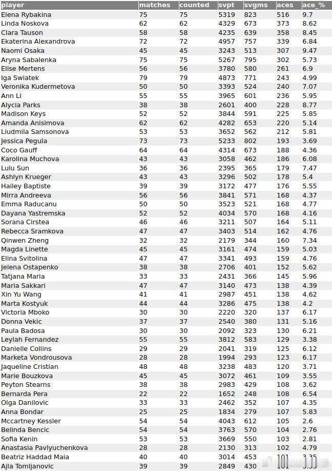 本赛季在WTA比赛至少轰出100+ACE,莱巴金娜516第一。郑钦文160、王欣瑜138!