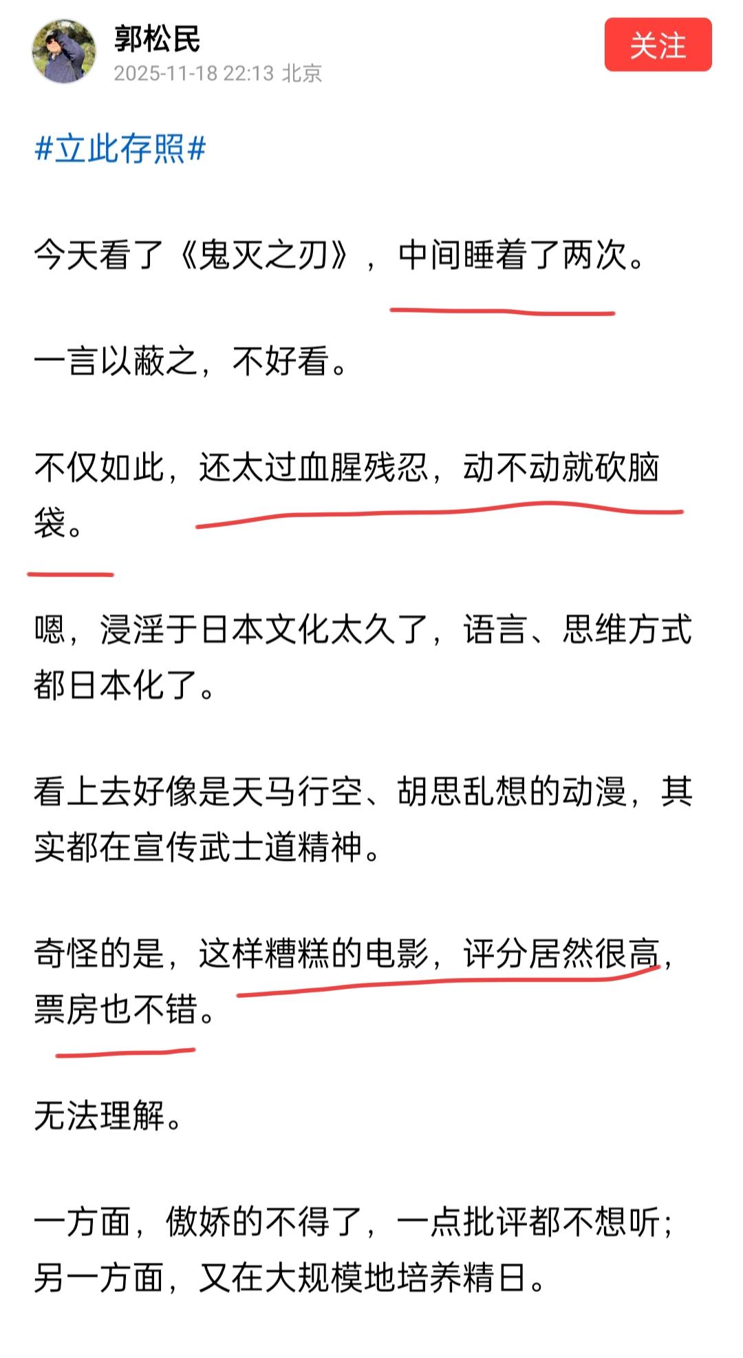 郭松民炮轰日本动漫电影《鬼灭之刃》。 11月18日晚上,郭松民先生发头条称,电影《鬼灭之刃》实在是太糟糕了, 为了去了解这部动漫,他还去电影院买了一张票,结果在看的过程中就都睡了两次。 郭忧心忡忡地说,这部电影血腥残忍,在文化格调上是不高的。然而,这部电影评分不错,票房也不错,老郭表示感觉到很困惑。 大家认为郭松民说的有没有道理呢?