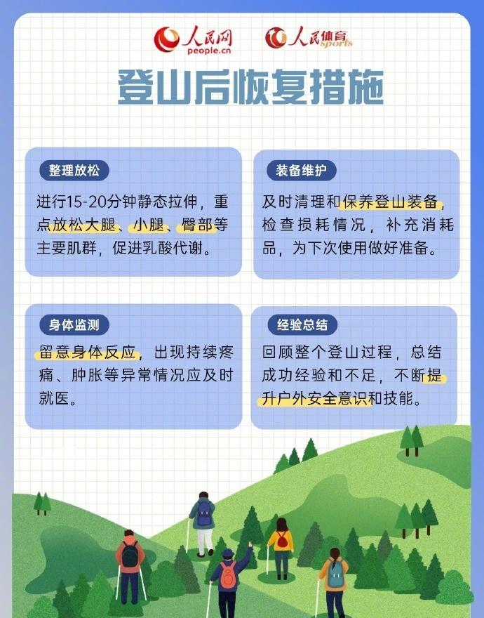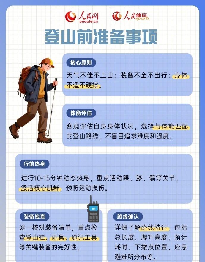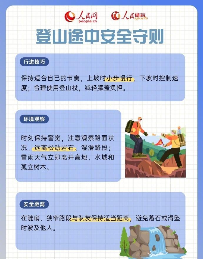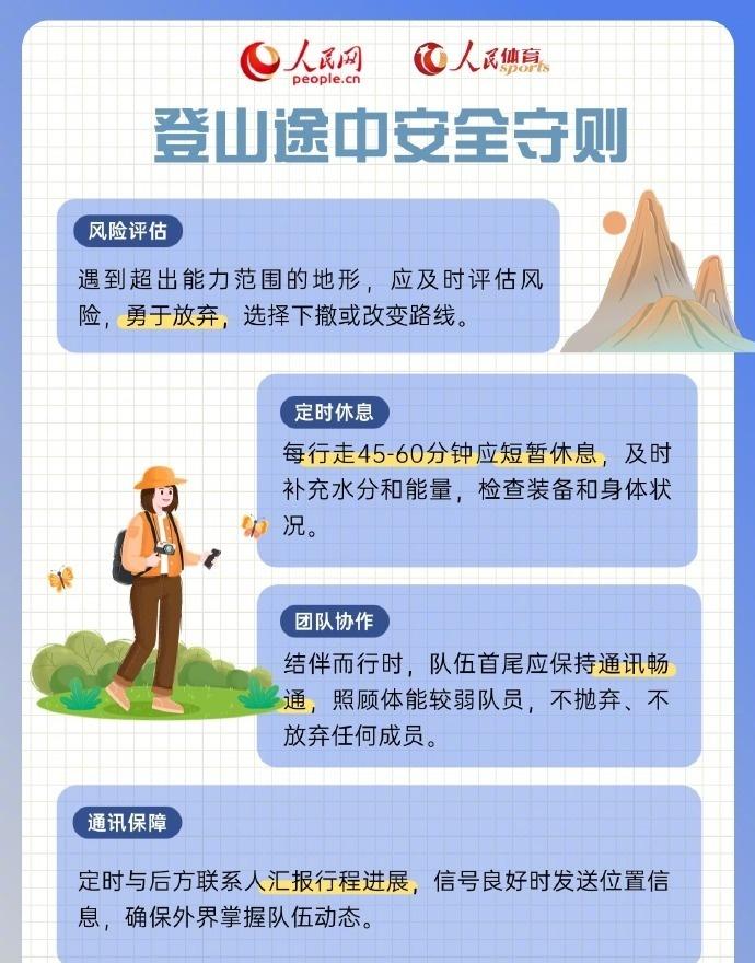 【收藏!超实用的登山安全指南·技巧篇】建议登山1至2小时补充一次能量大家在享受自然,感受登山乐趣之时,务必谨记安全永远是第一位的。请收好这份超实用的登山安全指南·技巧篇,遵循安全建议,让登山之旅安全又健康。祝愿大家每次都能快乐出发、平安归来。(人民网)