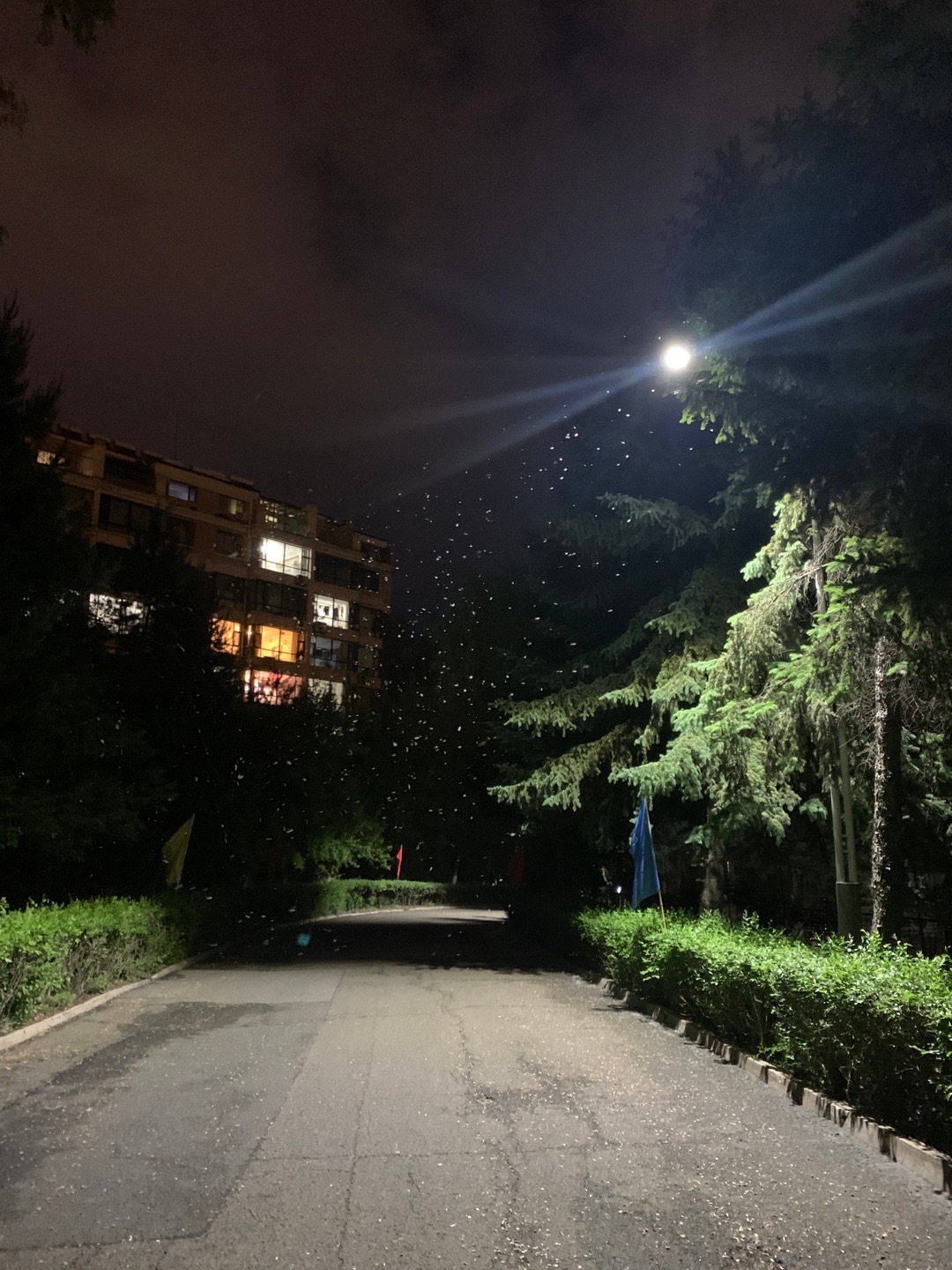 晚上领完快递回学校的路上,特意选了一条人少的路。远远就看到前方路灯下密密麻麻,飘忽的花瓣儿,刚开始还以为是雨后的飞萤,因为当天下午下了一场很大的雨,直到看到地上铺了一地的花瓣儿反应过来。第一次见这么多的花瓣随风飘落,在空中翩翩起舞。翻飞的花瓣,清新的空气,内心雀跃不已!