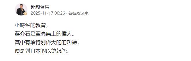 台湾知名政论家、坚定的统派人士邱毅,17号发的一篇文章,值得我们认真一读。 台湾最近和日本的关系有点微妙,岛内某些势力一边对日本点头哈腰,一边还把“抗中保台”挂嘴边,搞得两岸同胞看得心里不是滋味。 偏偏日本这几年在钓鱼岛、核污水排放、历史问题上一点没让步,甚至越来越强硬。岛内有些人还把日本当“亲爹”,这让不少台湾老百姓和大陆网友都看不下去。 尤其是日本新首相高市早苗竟敢在国会上公然叫嚣如果咱中国进行武统,日本将直接介入其中。更是将中日矛盾彻底八字爱明面上。 就在这样的大环境下,邱毅的那篇文章就像一记重锤。他直言,台湾人对日本的“感恩情结”该醒醒了,历史的伤痛不能忘,更不能用“以德报怨”来粉饰太平。 岛内一部分人听了觉得刺耳,但更多人拍手叫好,觉得邱毅说出了大家心里的话。有些人可能觉得,邱毅是不是太激进了?其实,邱毅说的话,真不是胡咧咧。 他一直以来就主张两岸一体,反对“台独”,对日本的态度一向很硬。早些年他在台湾政坛混得风生水起,不管在立法院还是媒体上,他从不怕得罪人。 这次更是直接点名日本,狠狠地捅了岛内“哈日”风气的马蜂窝。邱毅这次文章的关键词,就是“以德报怨”这四个字。 他直接点破,有些台湾人对日本感恩戴德,已经到了“迷信”的地步。可日本真的配得上台湾人感激吗?邱毅列了不少账本。 过去日据时期的剥削和压迫,台湾多少先辈吃过苦?再比如,二战后日本对台湾历史问题一推六二五,连道歉都不肯好好道,最近几年核污水排放还让台湾渔民叫苦不迭。 可岛内一些政客、媒体却还在替日本“洗地”,什么“日本人有风度”“日本很友善”,简直让人哭笑不得。 其实,台湾的“哈日”风气也不是一天两天形成的。早些年日本流行文化风靡台湾,动漫、日剧、日系商品一度成了年轻人的最爱。 再加上一些政客、媒体有意引导,搞得很多台湾人以为“日本啥都好”,甚至“日本人比自己人还亲”。 邱毅这次文章就像是给“哈日”风气浇了盆冷水。他说,文化可以欣赏,但历史和现实不能装糊涂。咱中国人要有骨气,不能一味当“舔日族”。 现实里,日本对台湾的利益从来都是精打细算,从没真把台湾当“自家兄弟”。这话说得直白,但很有道理。 台湾岛内“哈日”其实就是一些人缺乏自信,总觉得“外国月亮圆”。邱毅呼吁,台湾得找回自我认同,别总想着“傍别人”,得靠自己、靠两岸团结。 有朋友要问:那日本到底图啥?台湾“哈日”到底有啥用?其实,国际关系说白了就是利益二字。日本对台湾,更多是把台湾当“棋子”,用来牵制咱中国大陆。 只要能让台湾和大陆分裂,日本就乐得“坐山观虎斗”,甚至还能从中渔利。台湾有些政客心里明白这一点,但嘴上不说。 他们一边对日本点头哈腰,一边拿日本当“靠山”,目的就是在岛内收割选票、巩固地位。实际上,日本对台湾的“支持”全是有条件的,真正风头一过,日本很快就会“变脸”。 邱毅的观点很明确,台湾的根还是在两岸。无论外部怎么变化,台湾要想有前途,必须跟咱中国大陆搞好关系。靠日本、靠美国,都是“镜中花水中月”,指望不上,更靠不住。 邱毅提醒台湾同胞,别再被外部势力牵着鼻子走。两岸是“一家人”,团结才有出路。靠外人,最终吃亏的是自己。 邱毅在文中还特别提到,日本对台湾历史上的伤害不能忘,更不能用“以德报怨”来粉饰。日据时期的掠夺、二战后对历史责任的推卸,这些都是血淋淋的现实。 台湾同胞不能因为一时的经济利益、文化热潮,就把这些大事忘得一干二净。历史的记性,是民族的底线。 回头看邱毅这篇文章,不得不说,他的观点虽然刺耳,但却实在。他敢把大家不敢说的话摆在桌面上,这种态度,正是台湾社会最需要的。 有时候,社会就需要这样的人,敢于指出“皇帝没穿衣服”,不怕被喷、不怕被孤立。 台湾社会如果能多一些“邱毅”,多一些敢于直面现实、捍卫民族利益的人,岛内的风气肯定会慢慢变好。只有清醒的人多了,台湾才不会被外部势力“玩弄于股掌之间”。 邱毅的文章一出来,不止岛内网友点赞,连不少大陆网友也觉得这话说到了点子上。其实,两岸普通百姓都希望过安稳日子,不想被政客操弄,更不想被外部势力利用。 大家最关心的,无非是生活、经济、民生。两岸关系搞好了,大家都能“赢麻了”。可要是总被外部势力搅和,台湾百姓只能成“夹心饼干”,里外不是人。 邱毅这篇文章句句在理。日本对台湾的态度,从来都是“逐利而行”,哪有什么真感情?台湾社会要想不再做“感恩的冤大头”,就得认清现实,别再被外人牵着走。 历史是面镜子,照出过去的苦,也提醒未来的路。台湾的根在两岸,未来靠自己。希望更多人能像邱毅一样,有骨气、有见识,敢于说真话、做实事。 这篇文章,值得每个人认真一读,也值得咱中国人都静下心来,好好思考:什么才是最该守住的底线,什么才是最靠得住的亲人。 参考资料: 《小时候的教育》——邱毅台湾