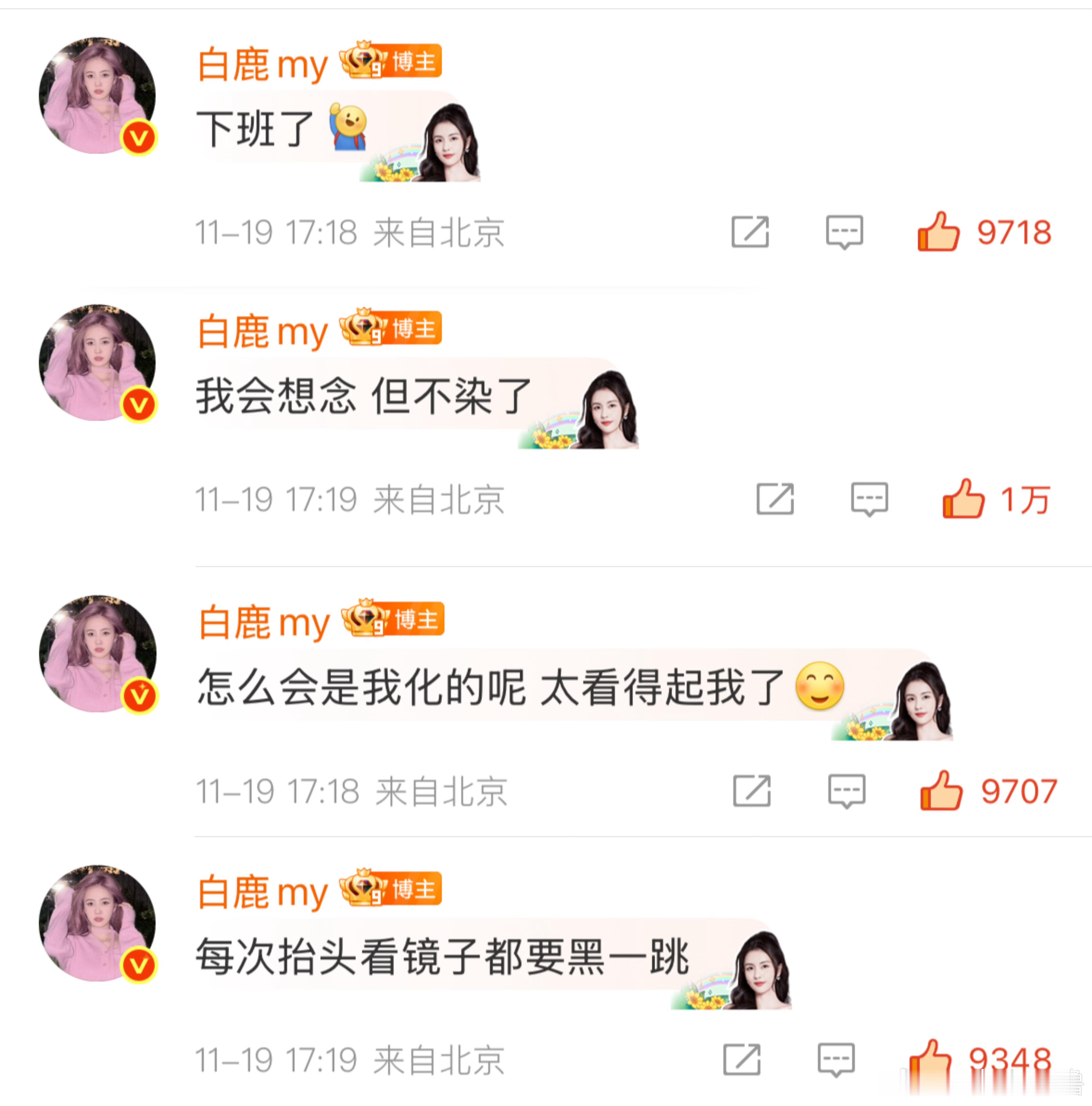 《害》《结束叛逆》《下班了》《我会想念 但不染了》《怎么会是我化的呢 太看得起我了》《每次抬头看镜子都要黑一跳》白鹿就这样可爱的下班来报备 染回黑发来报备 来分享心得 来和鹿茸聊聊天 我宝宝就这样爱鹿茸 这样爱分享嘻嘻嘻嘻嘻🫶🏻 /