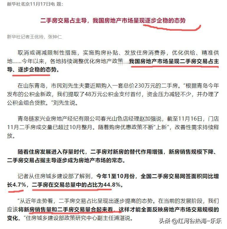 房地产市场逐步企稳。 那些期待楼市出大利好的人要失望了。 看不见的手要的是成交量,而不是价格。 今年1月到10月,全国二手房网签面积增加了4.7%。 这个成交量人家已经满意了,觉得可以了。