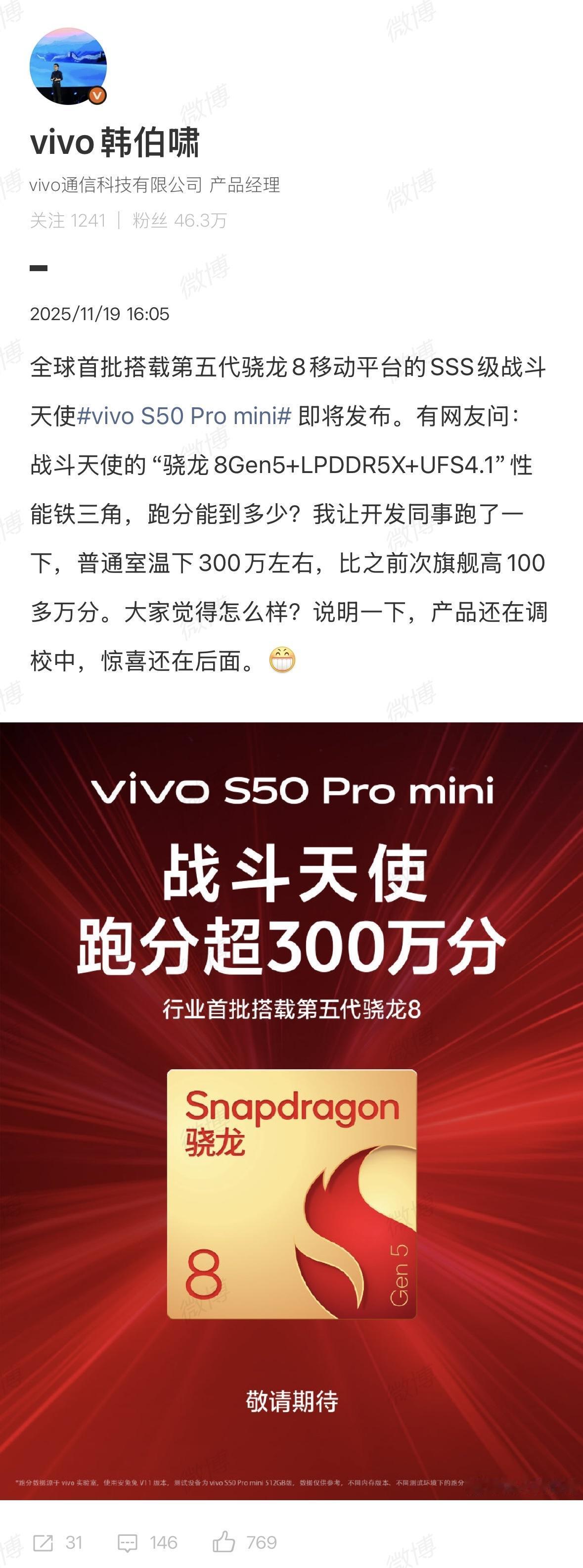 vivo S50 Pro mini: 骁龙8 Gen5处理器 LPDDR5X+UFS4.1 S系列跨代升级啊!