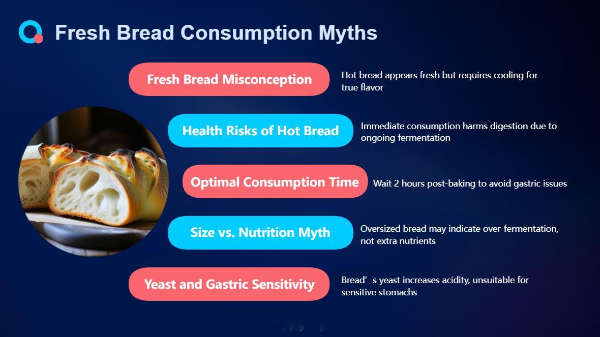 刚烤好的面包新鲜又好吃很多人都认为刚出炉的面包新鲜又柔软,吃起来爽口。其实,刚出炉的面包不能立即吃。刚出炉的面包闻起来是香,但那是奶油的香味,而面包本身的味道是在完全冷却后才能品尝出来的。任何经过发酵的东西都不能立刻吃。如果刚出炉的面包还在发酵,立即吃会对身体有害无益,容易引发胃病,面包至少放上两个钟头才能吃。此外,有的人挑选面包喜欢挑大一点的,有些人喜欢吃大而松软的面包,说口感好。其实面包发酵也有一个度,体积过大也许是它发酵过度,不见得营养就多一些。其实胃不好的人不宜吃太多面包,这是因为面包含有酵母,容易产生胃酸。|||